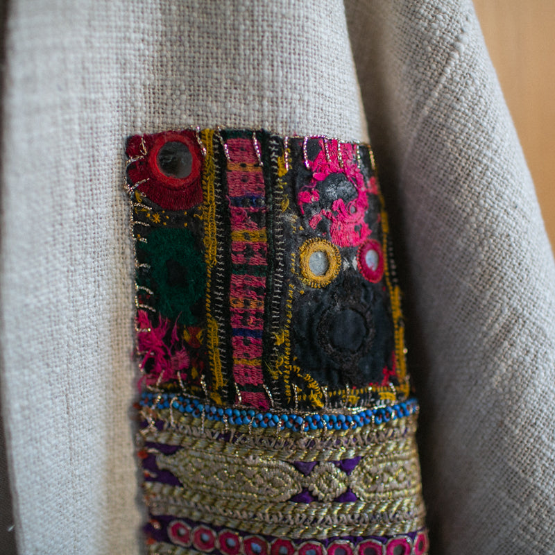 Embellished with hand selected, assorted and sewn vintage textiles from our visit to the Jaipur markets.