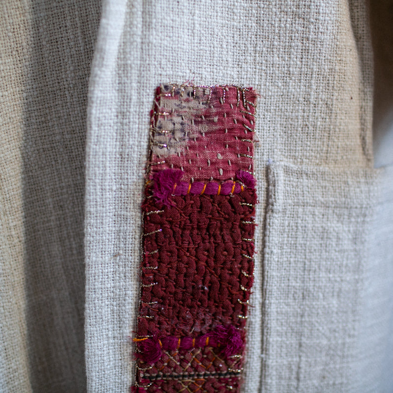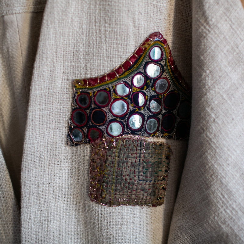 Embellished with hand selected, assorted and sewn vintage textiles from our visit to the Jaipur markets.
