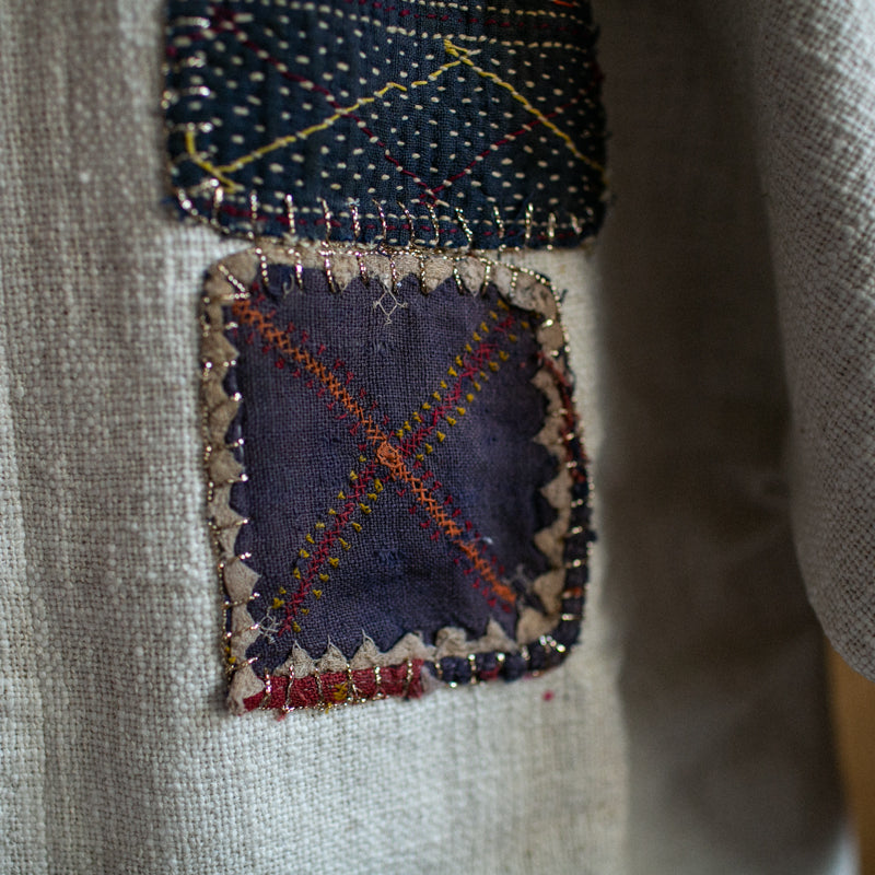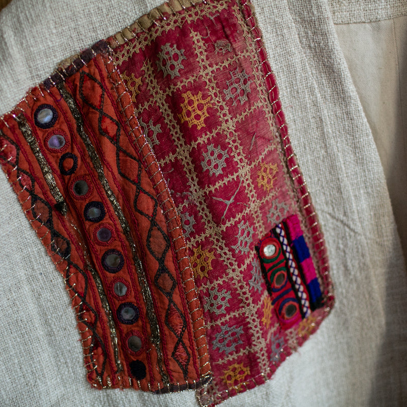 Embellished with hand selected, assorted and sewn vintage textiles from our visit to the Jaipur markets.