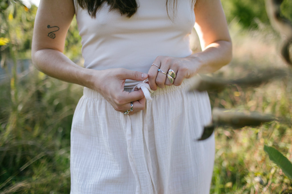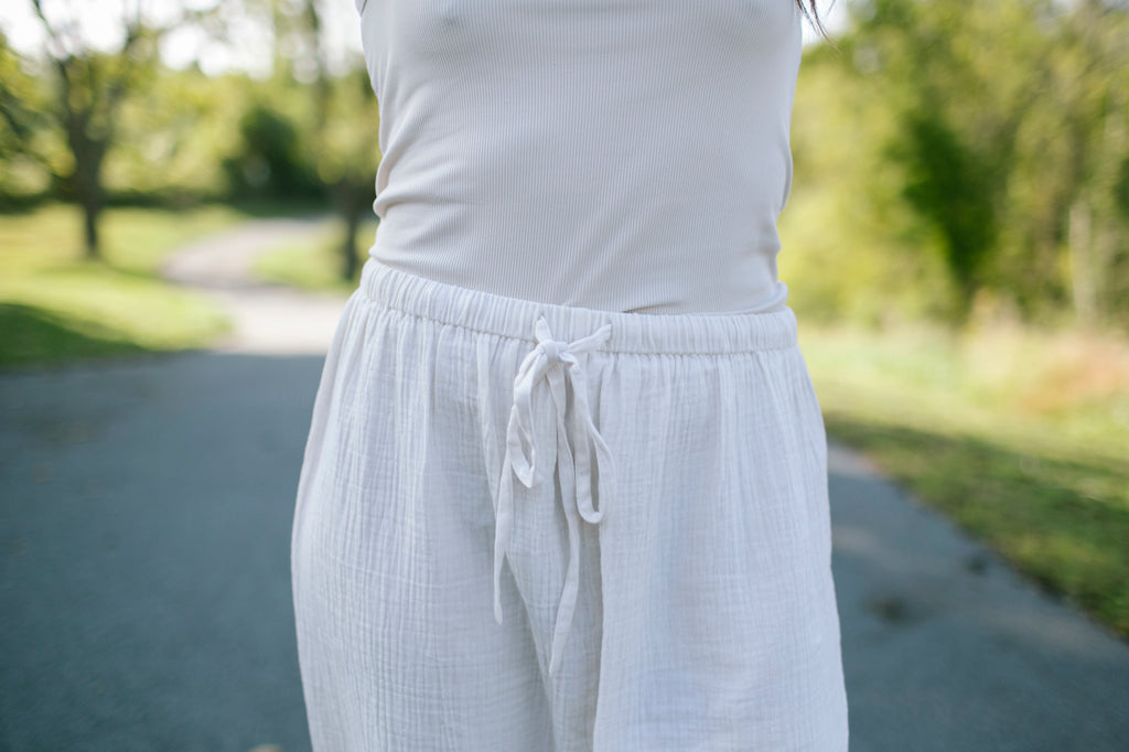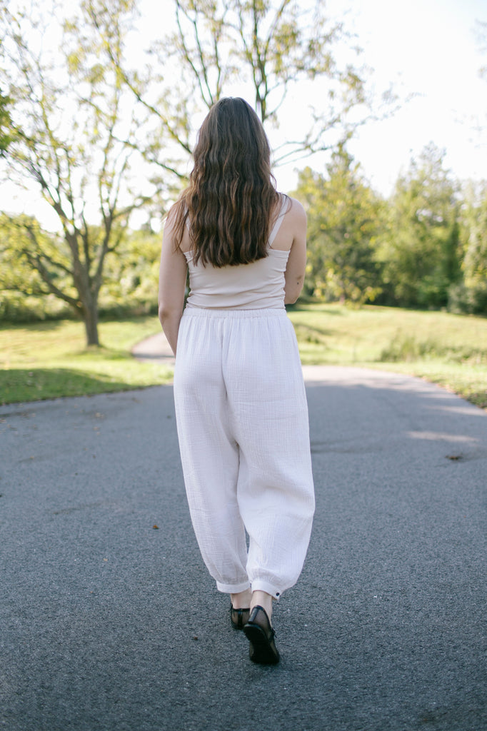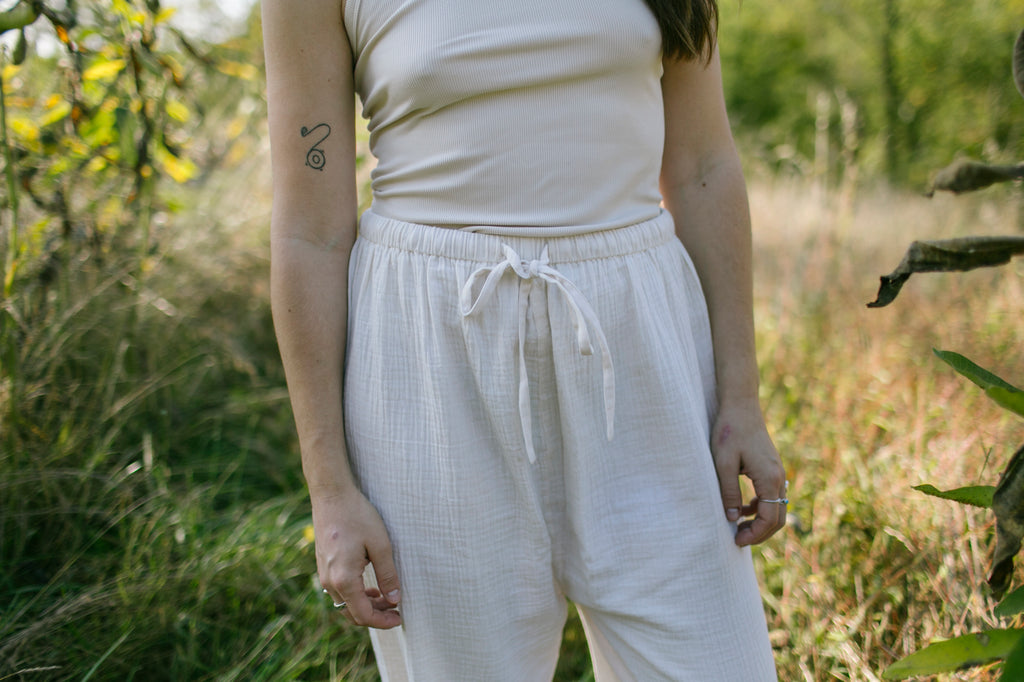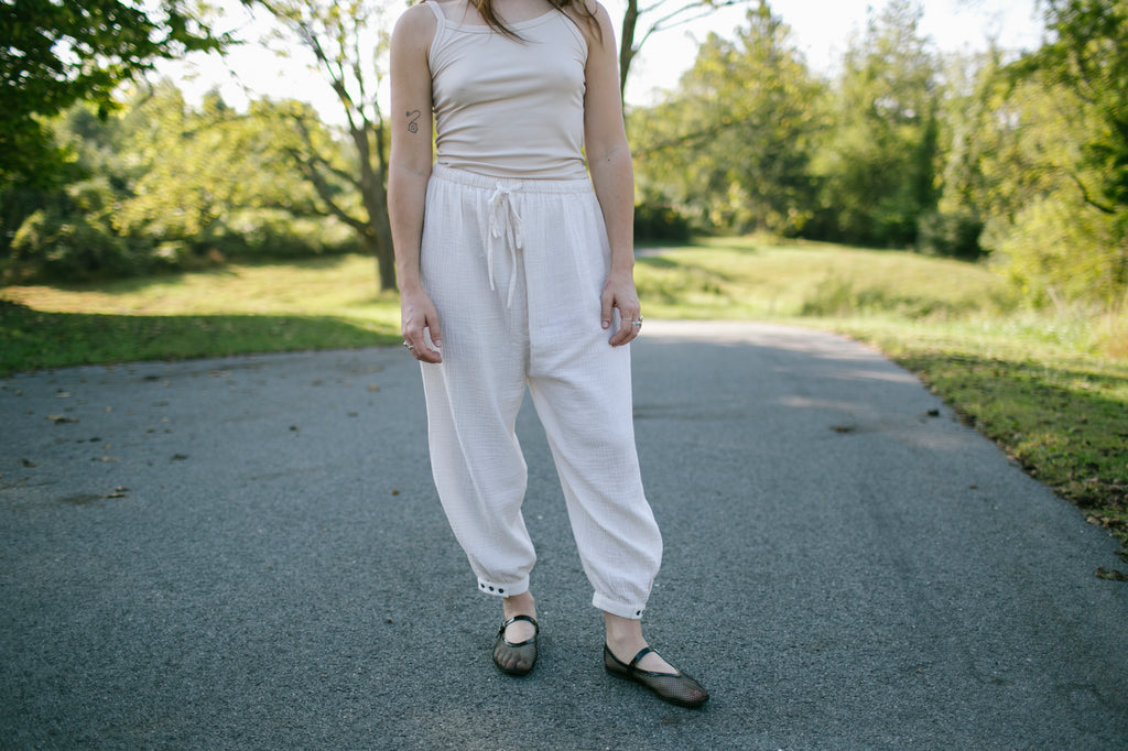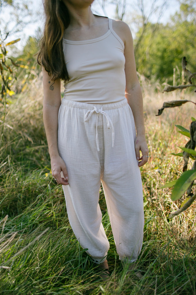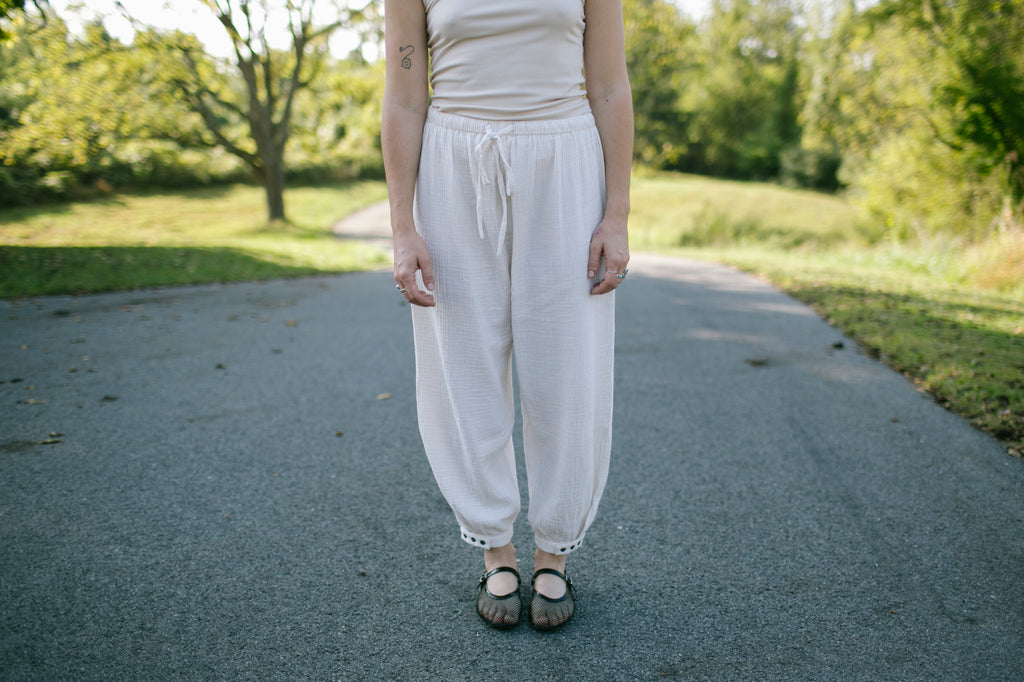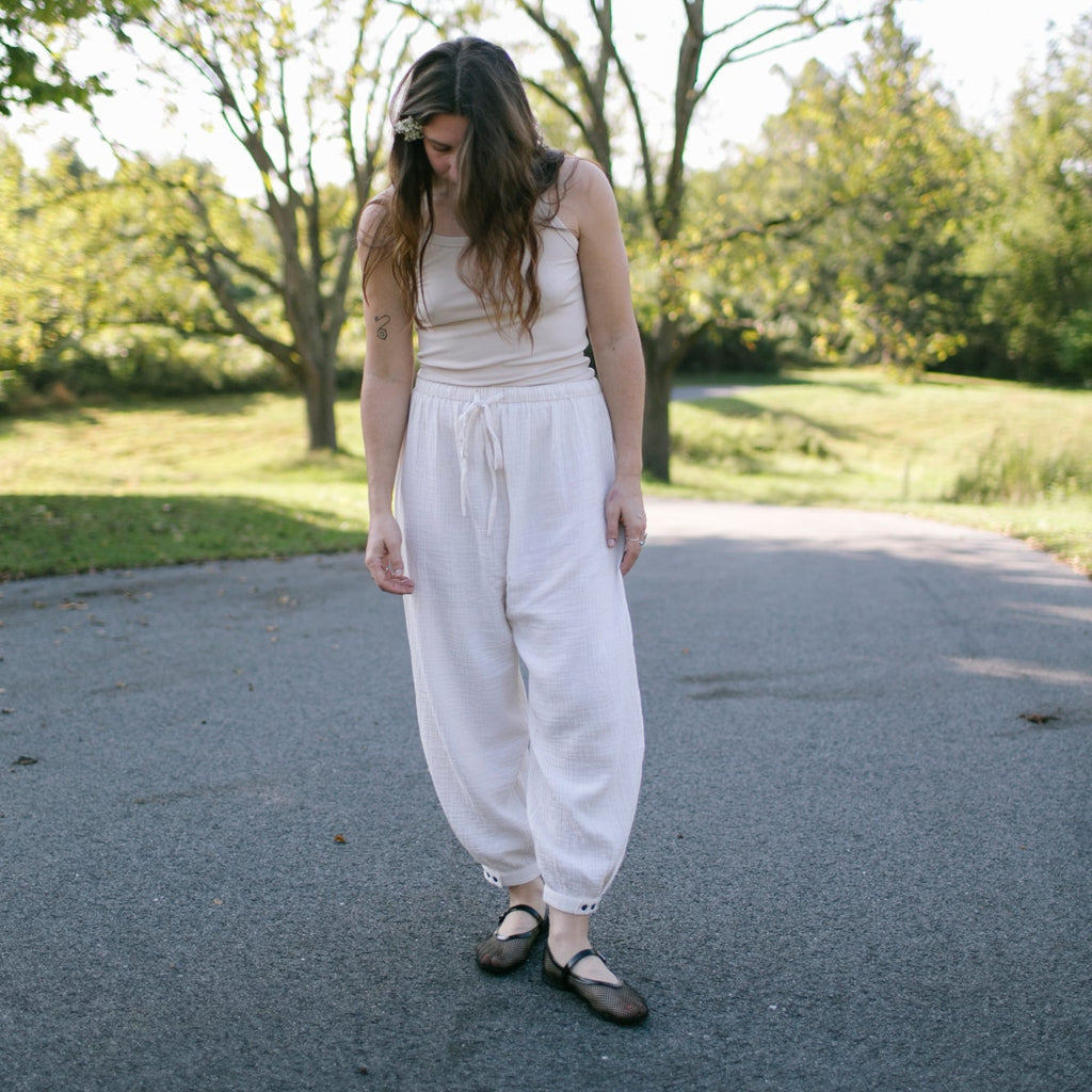 The color and softness of a cloud itself... Theses trousers are handmade with a beautiful off-white double gauze... embellished with four contrasting black fabric covered buttons on the ankle, an elastic waist, and adjustable drawstrings. Designed to be worn high or low waisted