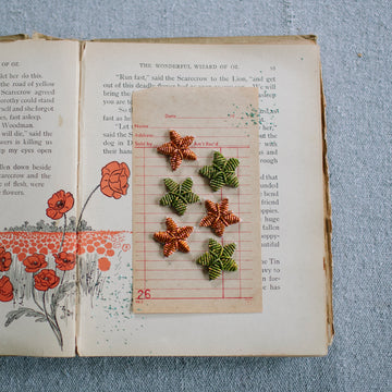 A sweet bundle of 6 vintage inspired star embellishments in a special custom color way for our OZ inspired collection. Each one carefully handmade using a beautiful assortment of metallic green and copper bullion. Stiff backside perfect for crafting or gift embellishing.