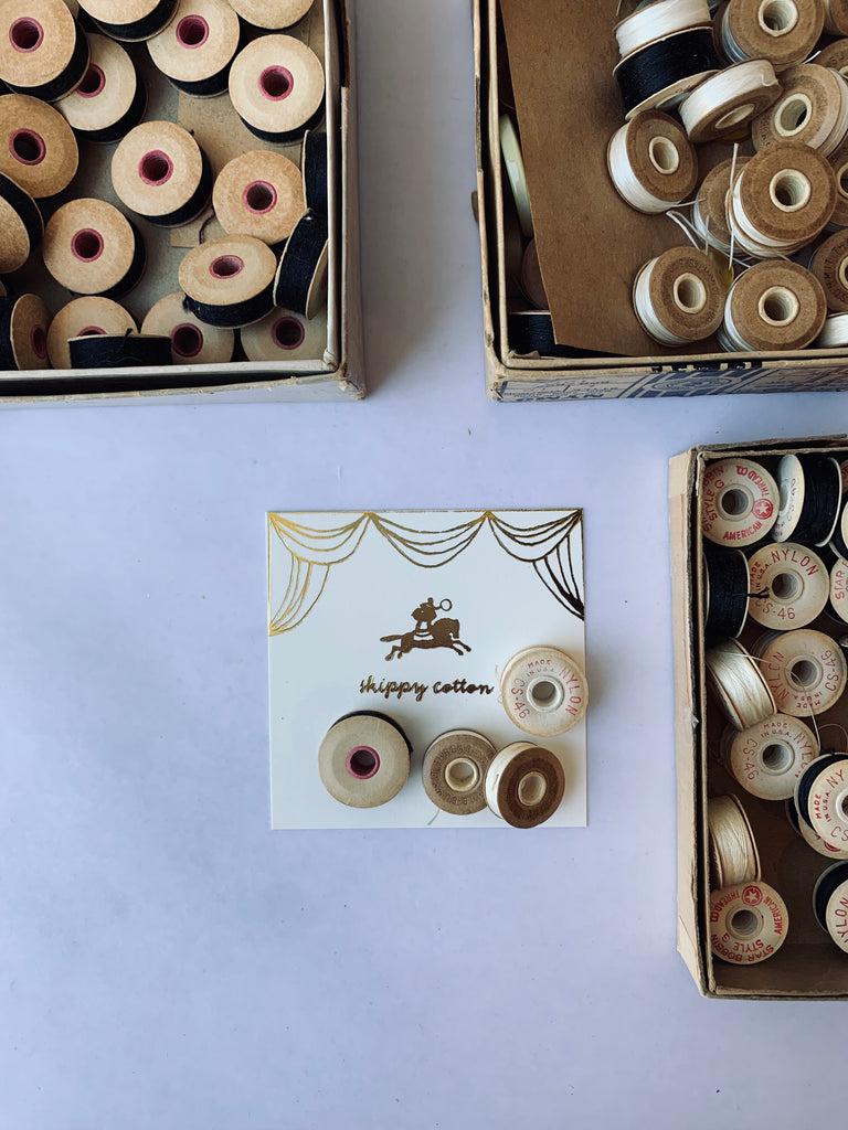 Four vintage paper bobbins of nylon, sweetly sealed in a 3X3" decorative foil pressed package. A sweet gift to any collector, lover of antique notions, or to oneself!