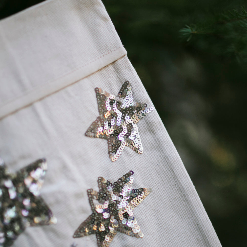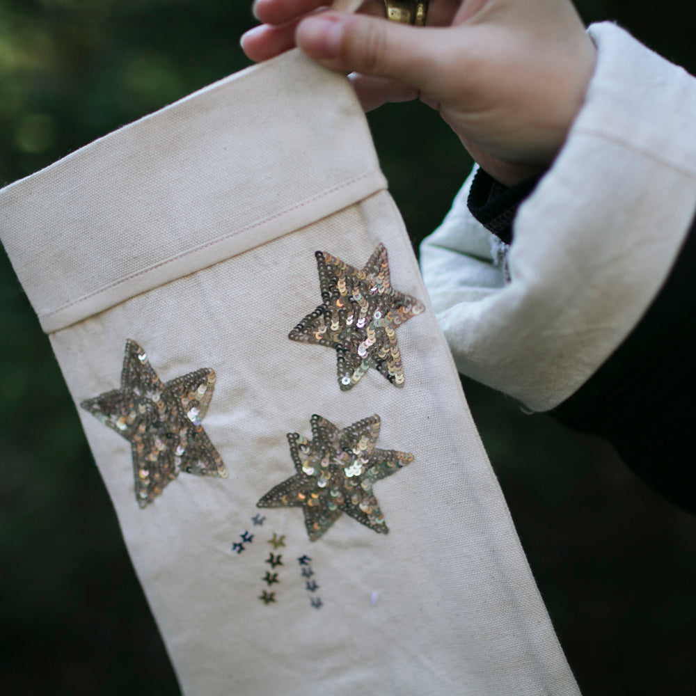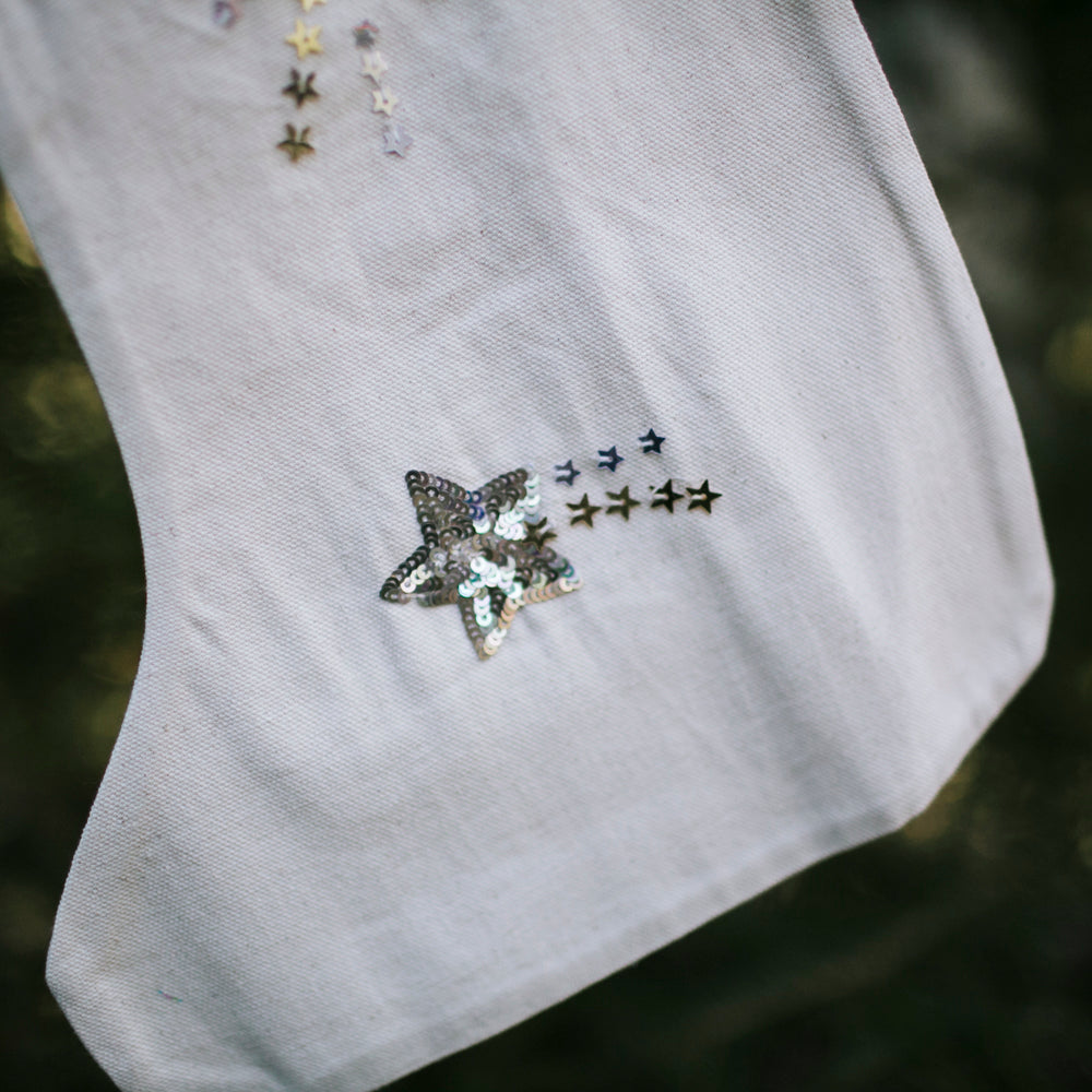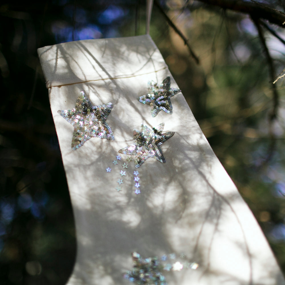 A complimentary stocking to our Celestial Moon Phase Treeskirt, adding magic to your holiday decor with our handmade canvas Christmas stocking, beautifully embellished with clusters of sparkling sequin stars. Available in two enchanting color variations—classic silver and vibrant neon multicolor—these stockings are perfect for bringing festive charm to your mantle.