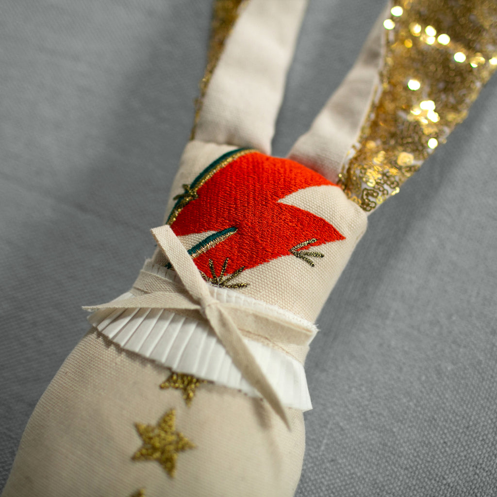 Embellished with gold sequin lining inside his giant floppy ears, a ruffly collar around his neck, and three gold metallic stars on his chest.