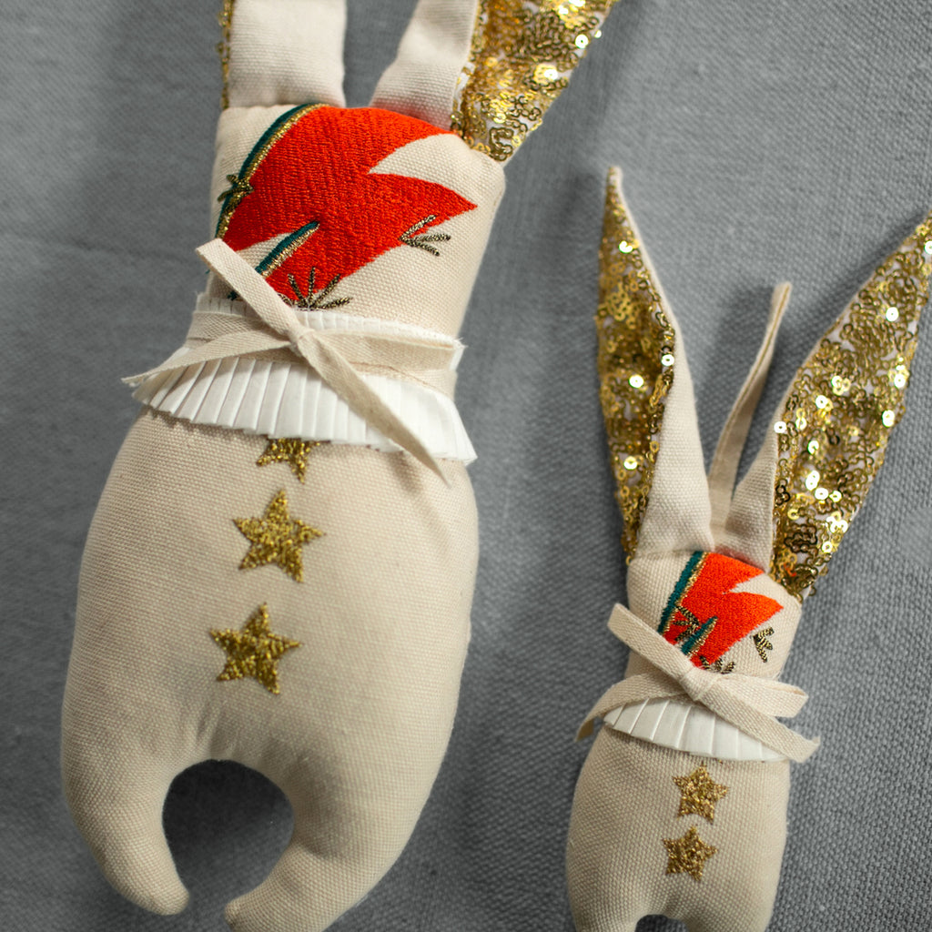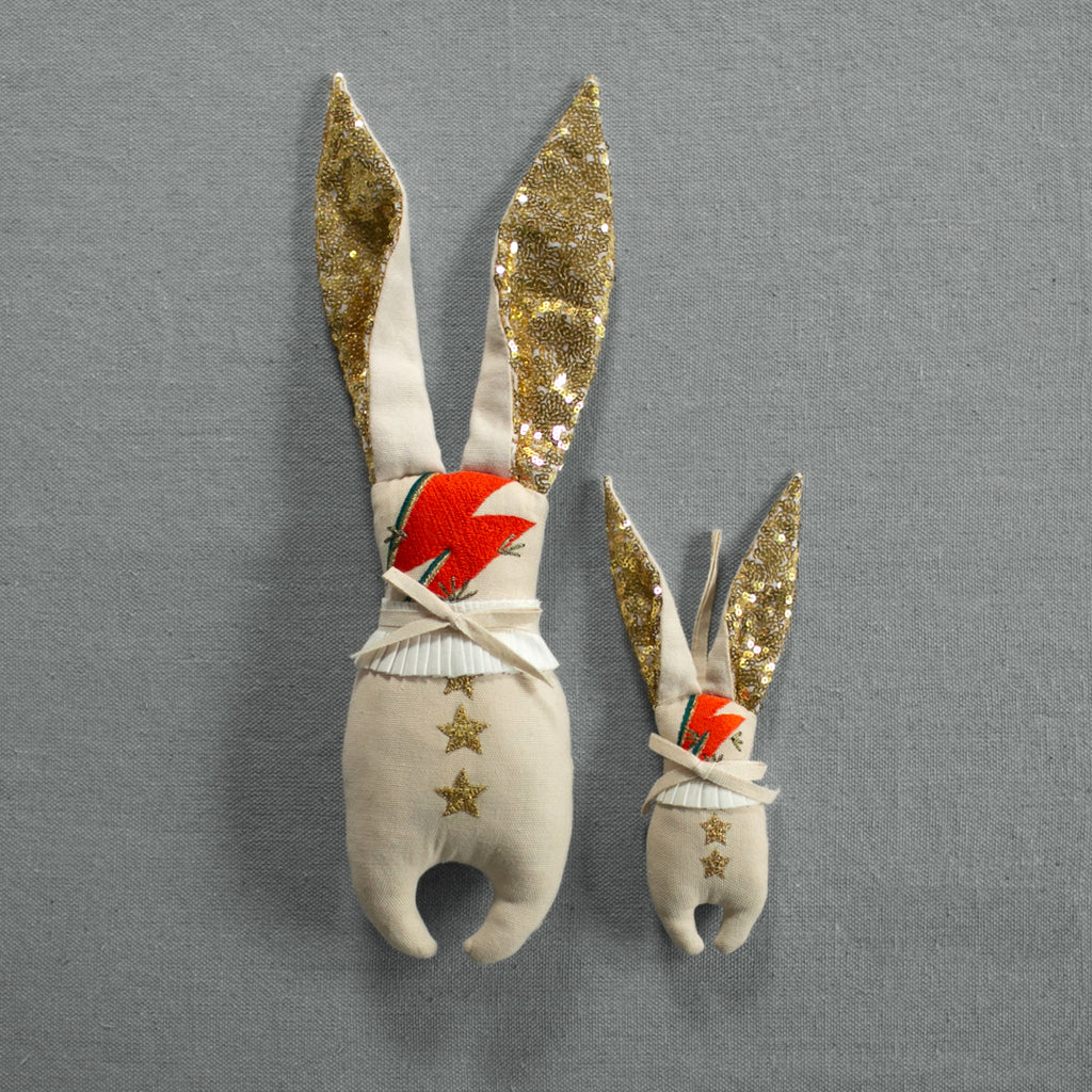 Shown pictured beside it's mini, the Bowie Bunny Ornament.