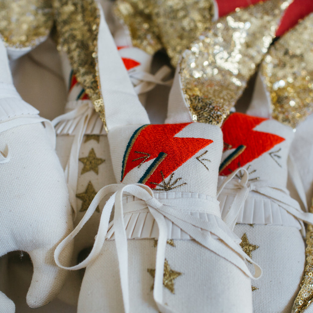 This little Ziggy Bun is made from a soft cotton and stuffed with organic cotton stuffing. His big orange and turquoise lighting bolt is machine embroidered.