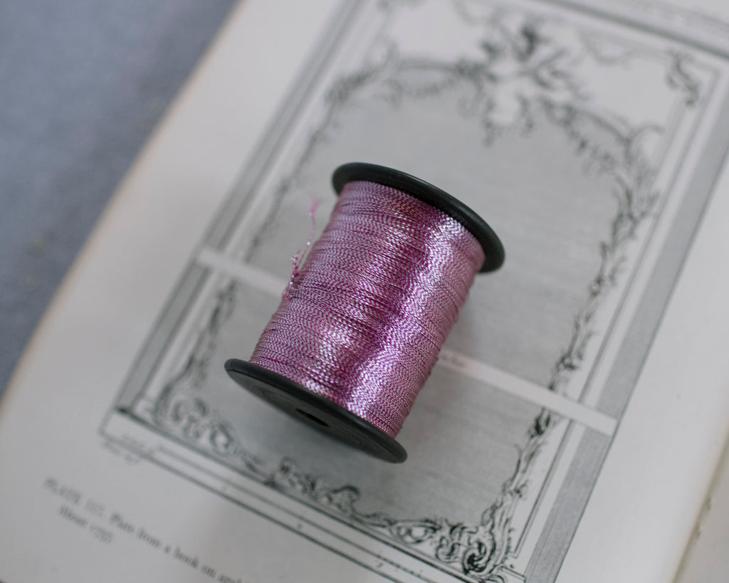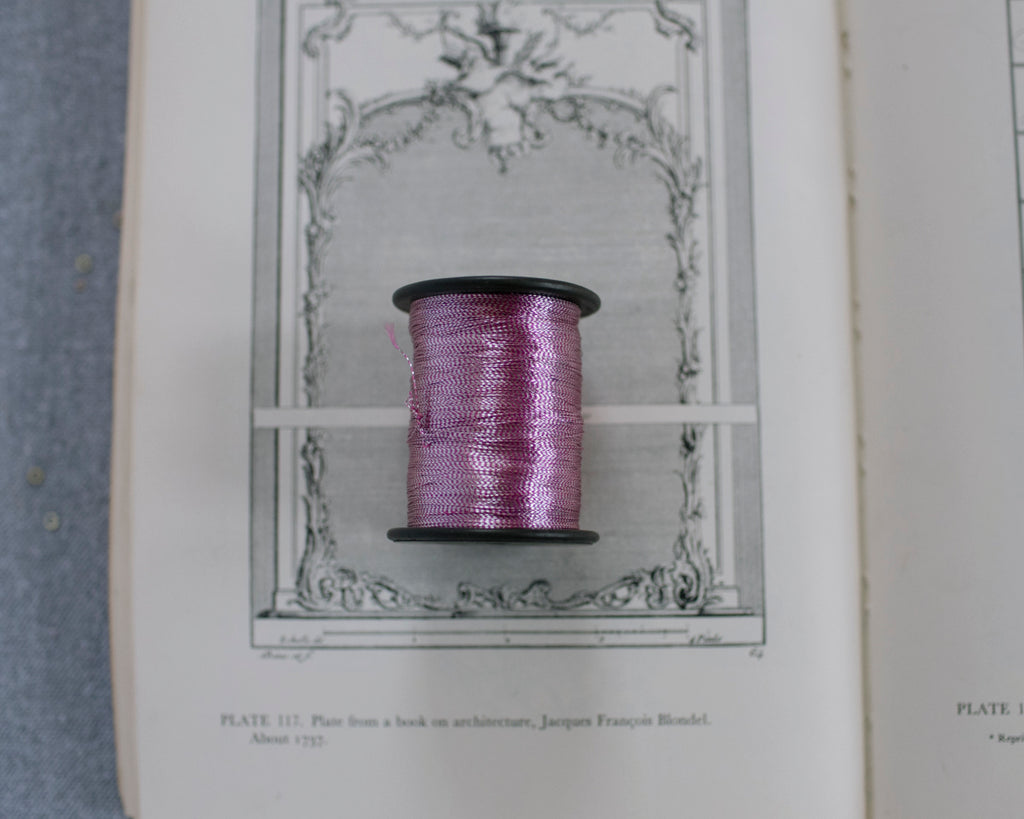 Lovely luminous pink thread—somewhere between lavender and dusky rose, depending on the light. Collected in India, each one holds a delicate metallic thread perfect for hand embellishment, mixed-media magic, or simply adorning your studio shelves.