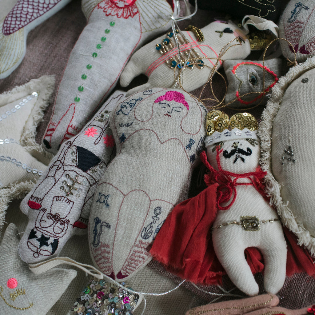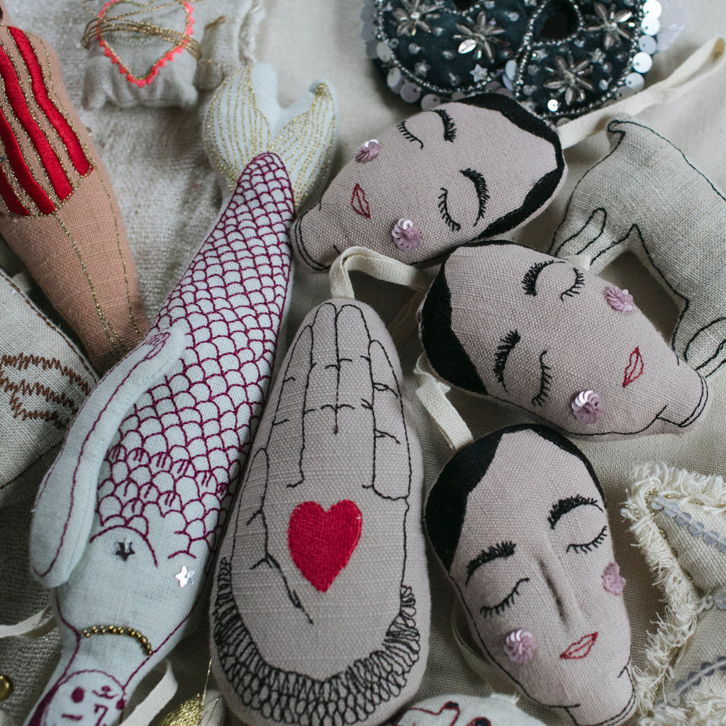 A carefully selected bundle of our sweet little ornaments. These ornaments have varying imperfections such as inconsistencies in stuffing, embroidery, or faint markings.