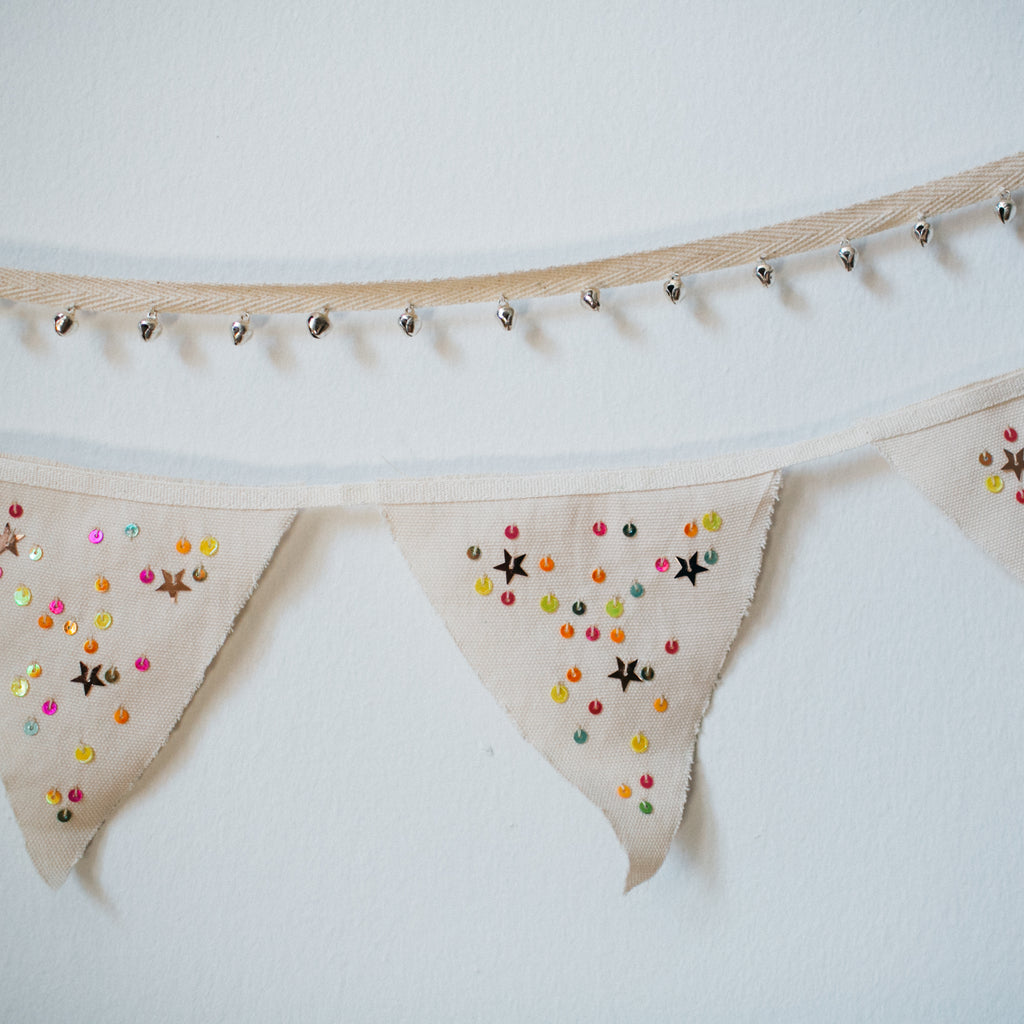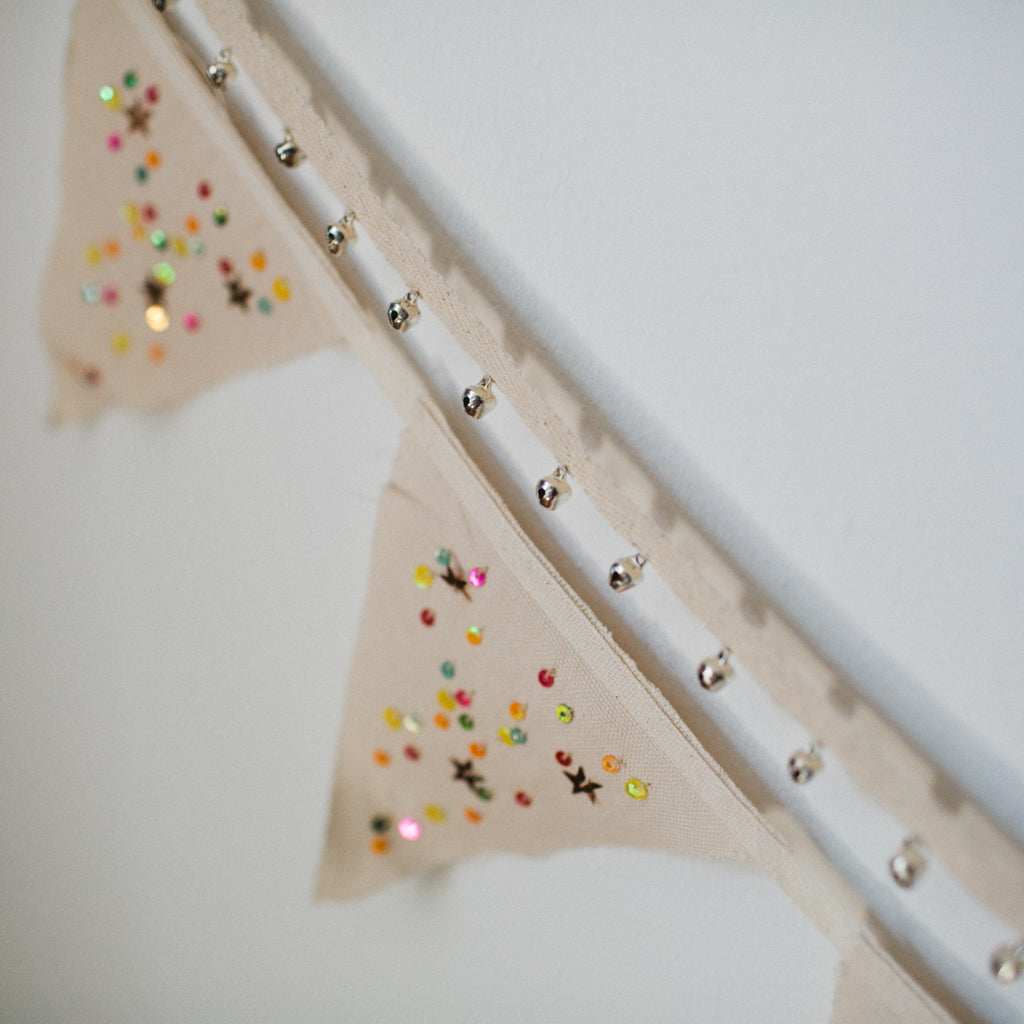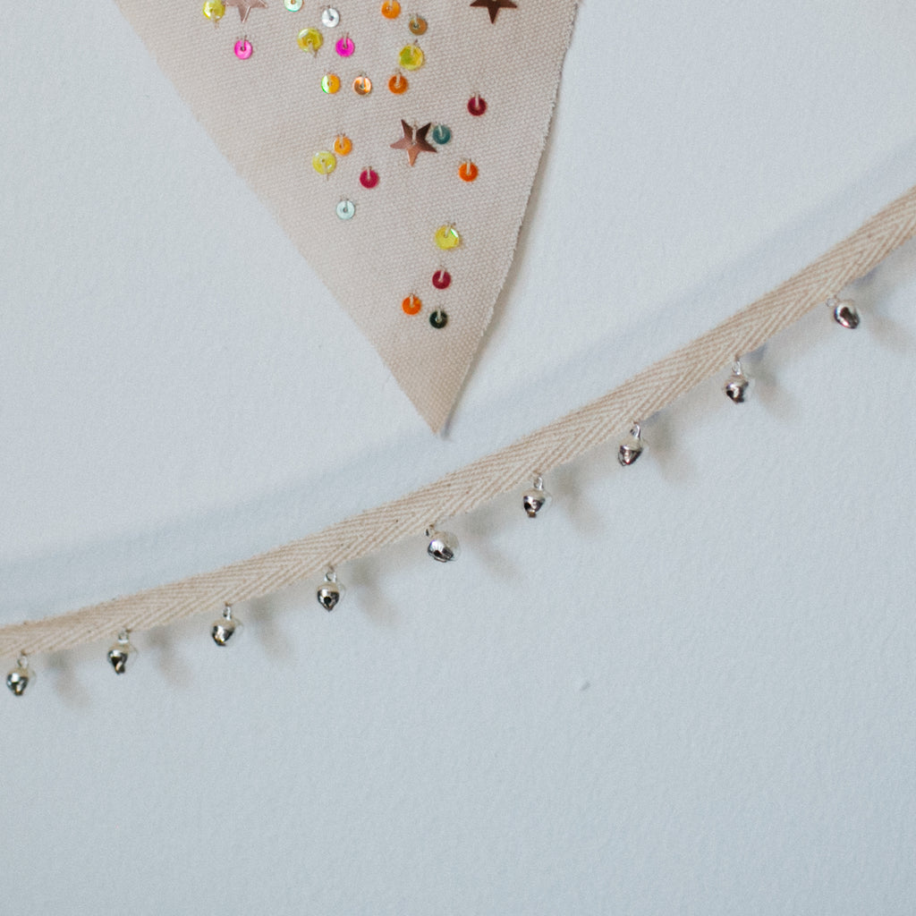 Tiny jingle bells hang from soft natural twill tape on this lovely garland- can definitely be used year round, but looks magical on a Christmas tree!
