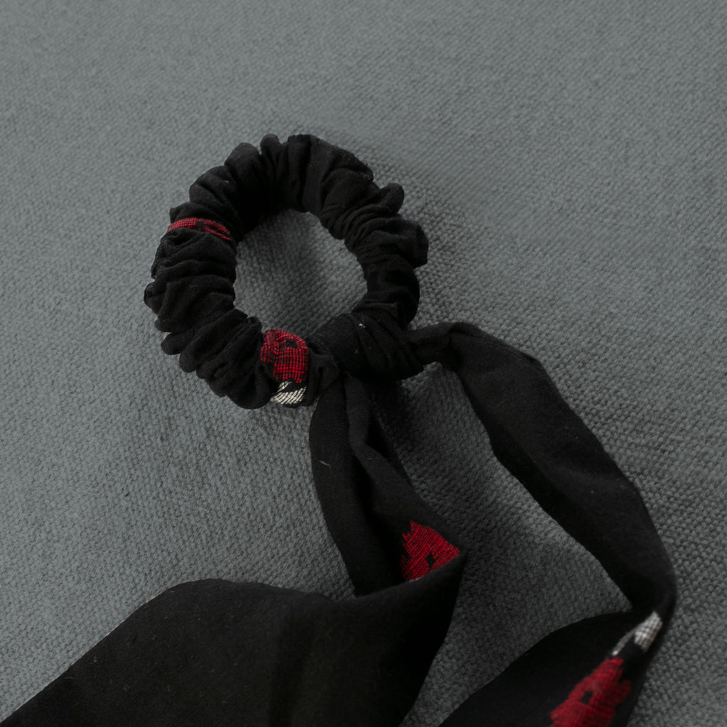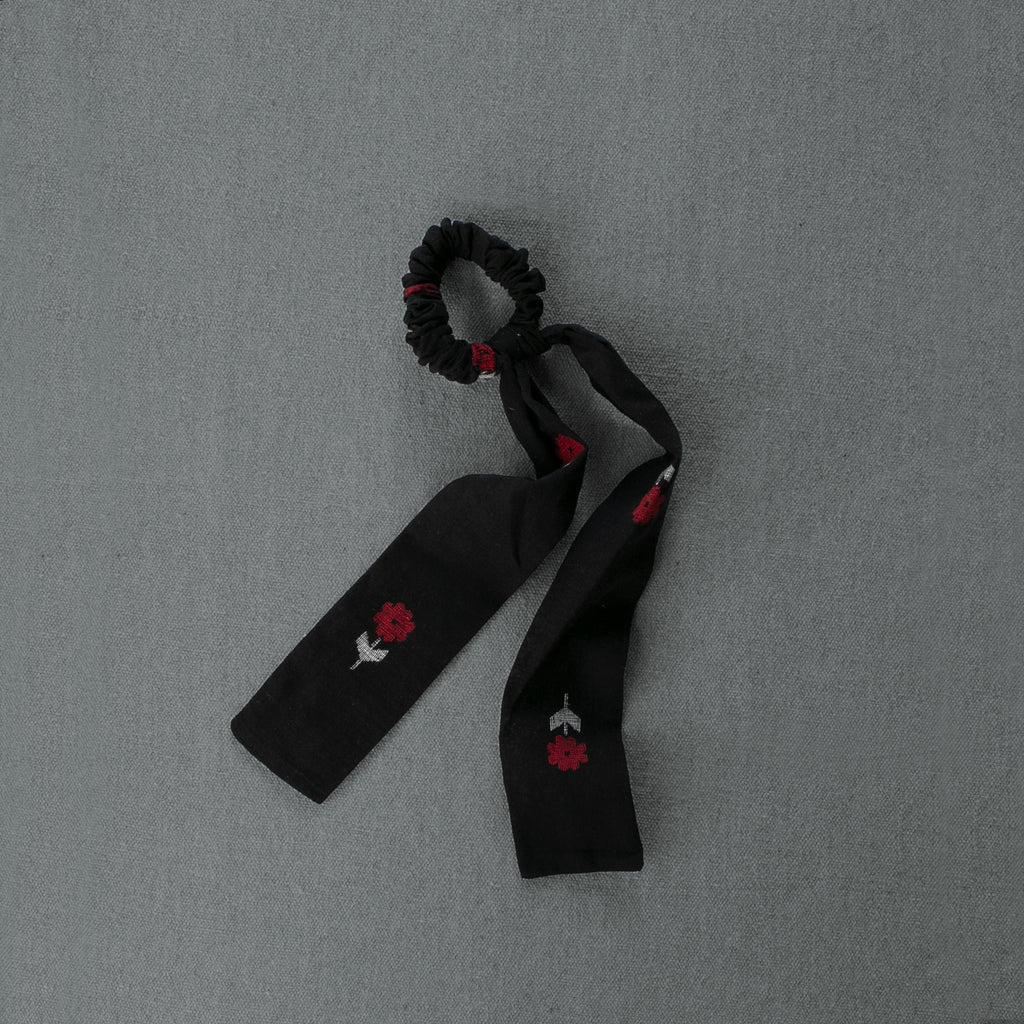 Inspired by our recent 'Red Brick Road' collection, this hair accessory features an elegant red and white poppy design woven into luxurious handwoven black cotton. The soft elastic band accommodates various hair types and lengths effortlessly, while the nine-inch fabric tails offer styling flexibility—wear them flowing freely or cinch them into a bow for added dimension if desired.