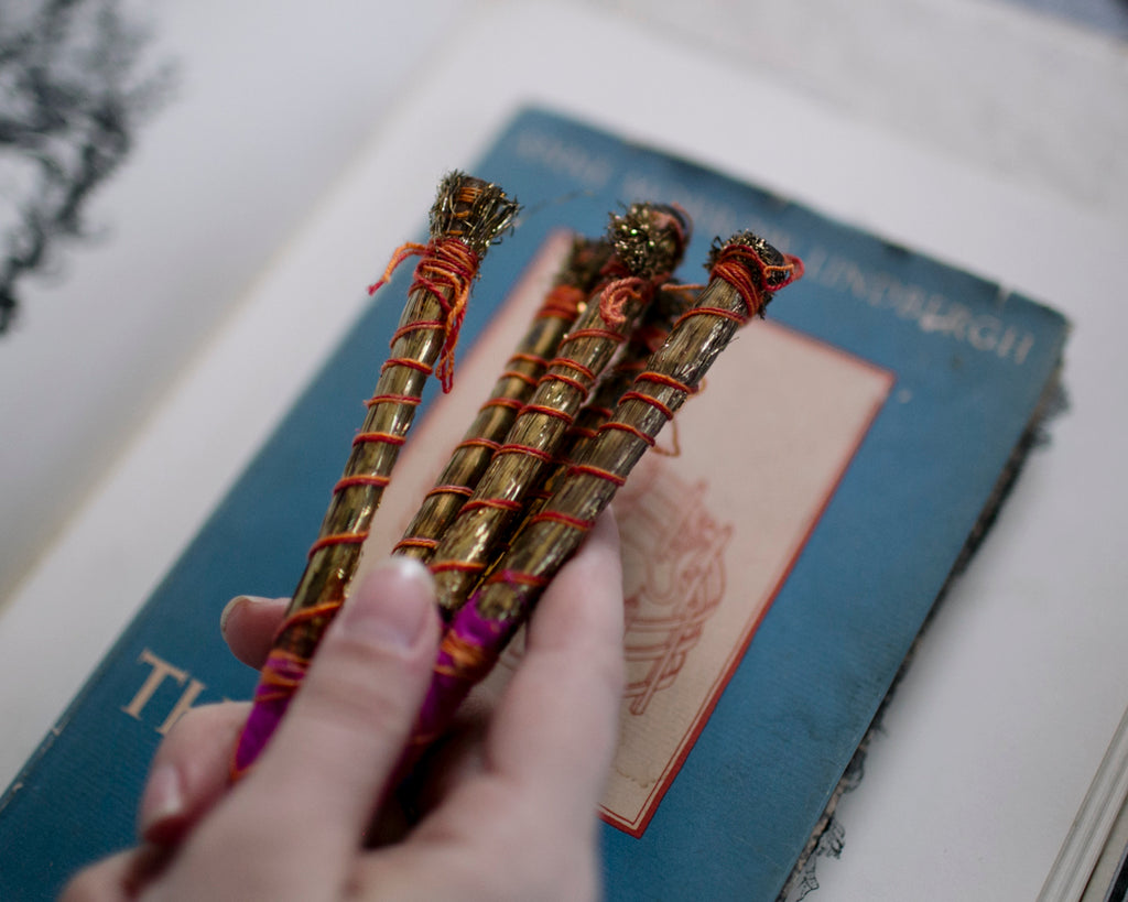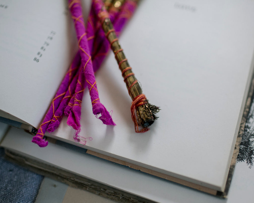 A rare and radiant treasure collected in India, this antique tassel was originally crafted for a festival pony—its vivid fuchsia threads tightly wound in ceremonial string and adorned with delicate metallic fringe. Designed to catch the light, it carries the spirit of celebration, and ornamentation.