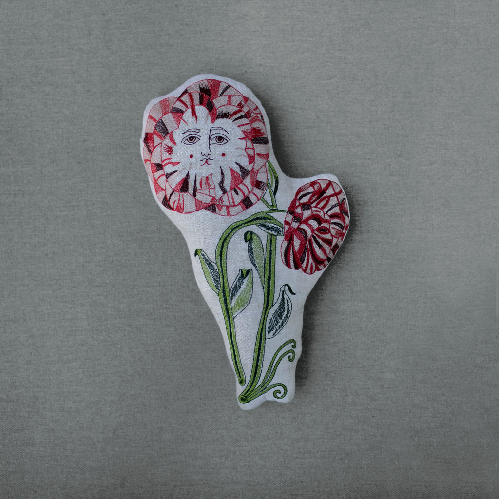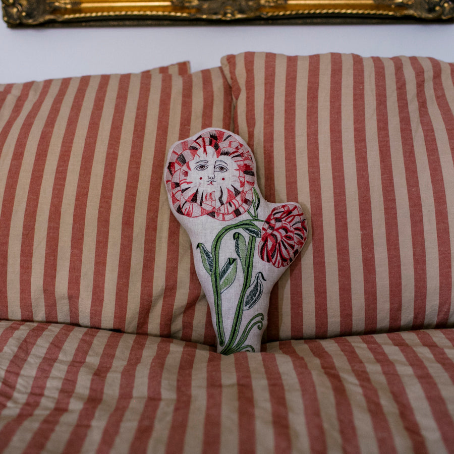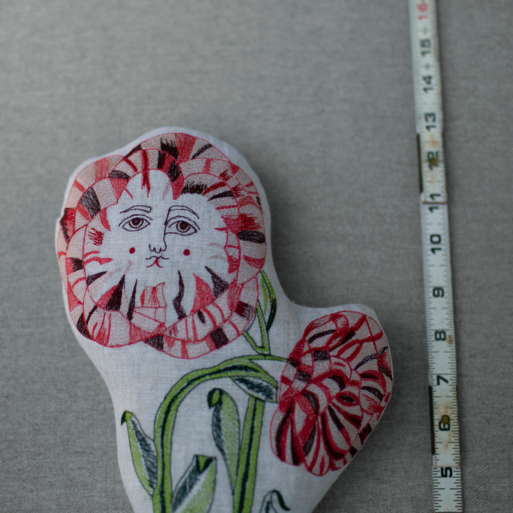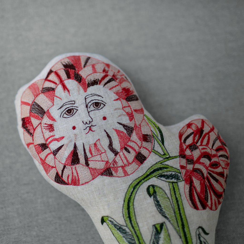 Crafted from natural linen and machine embroidered with vibrant threads, stuffed with organic cotton for a sturdy feel, every pillow is handmade, making each one a unique keepsake of color, texture, and storytelling.