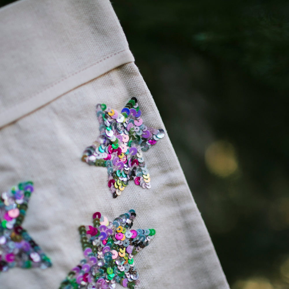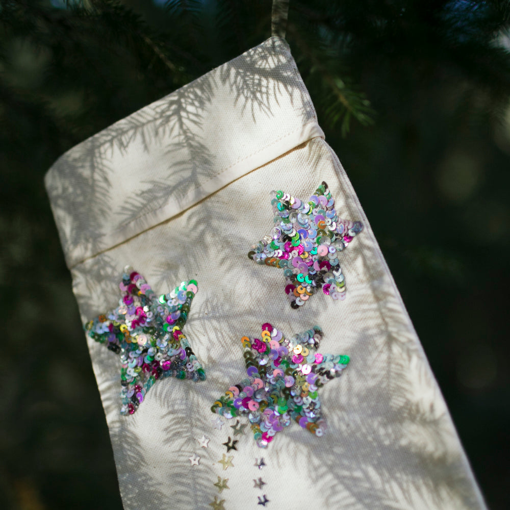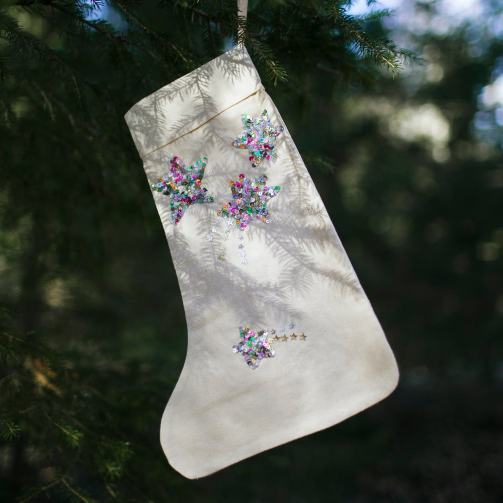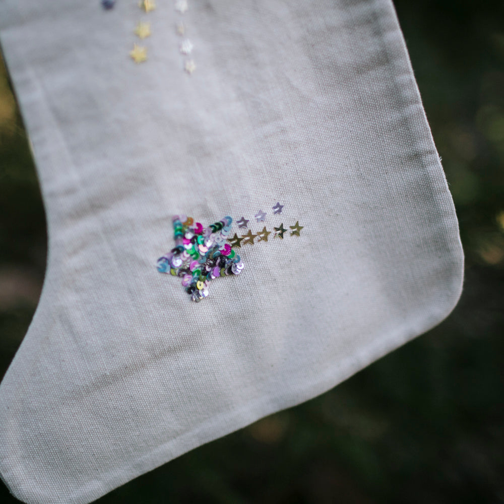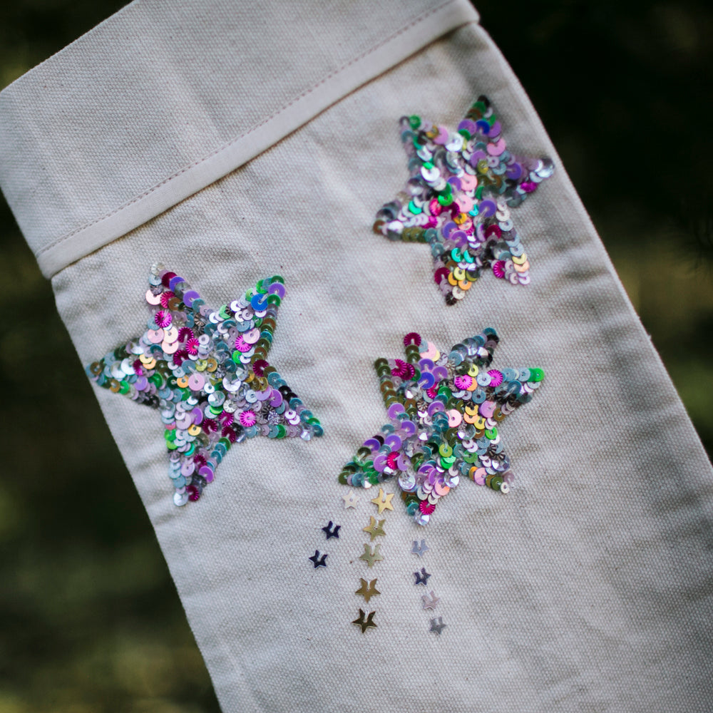 A complimentary stocking to our Celestial Moon Phase Treeskirt, adding magic to your holiday decor with our handmade canvas Christmas stocking, beautifully embellished with clusters of sparkling sequin stars. Available in two enchanting color variations—classic silver and vibrant neon multicolor—these stockings are perfect for bringing festive charm to your mantle.