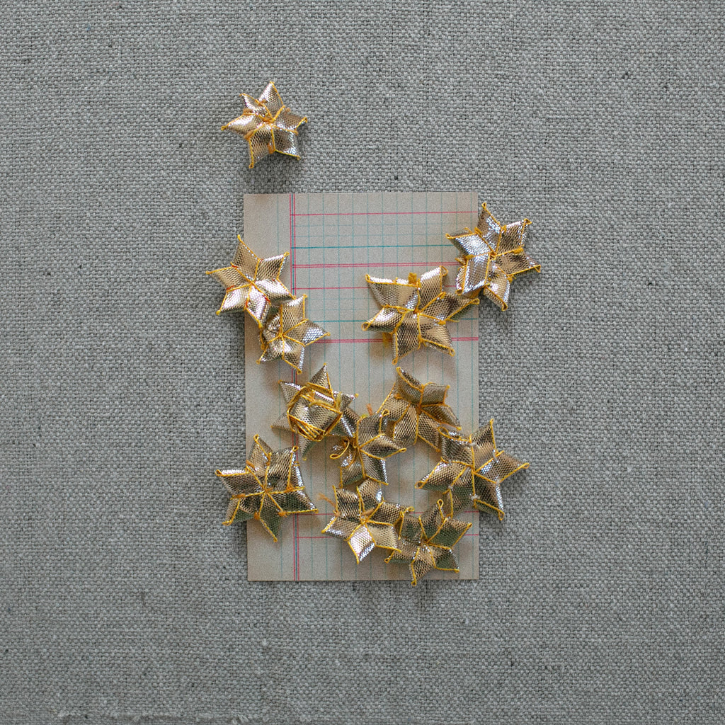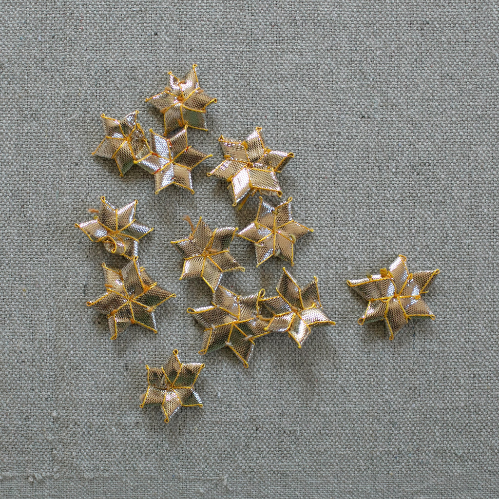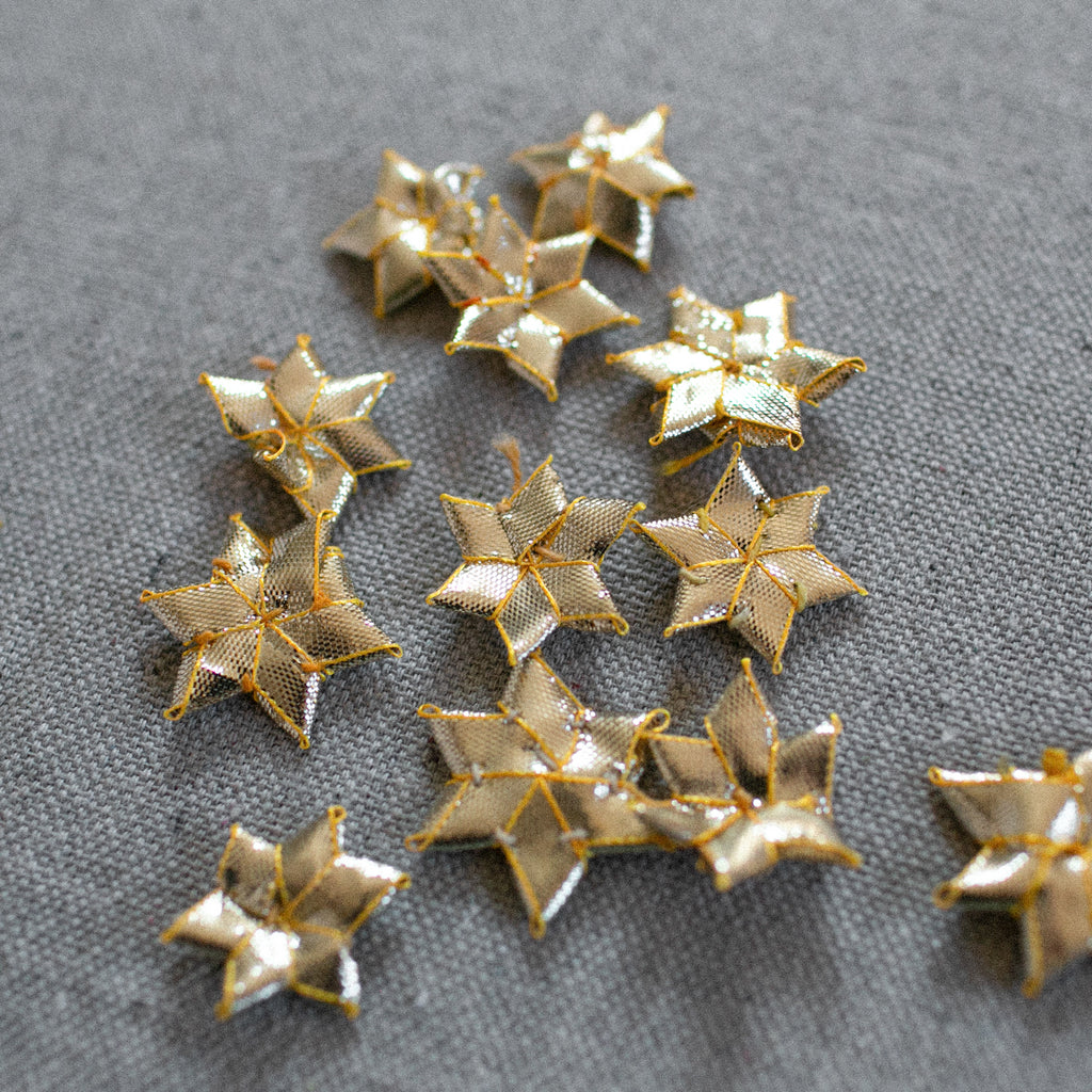 A sweet assortment of one dozen vintage inspired star embellishments. Each one carefully handmade using soft lurex ribbon. Stiff backside perfect for crafting or gift embellishing. Can be hand sewn or adhered to most surfaces.