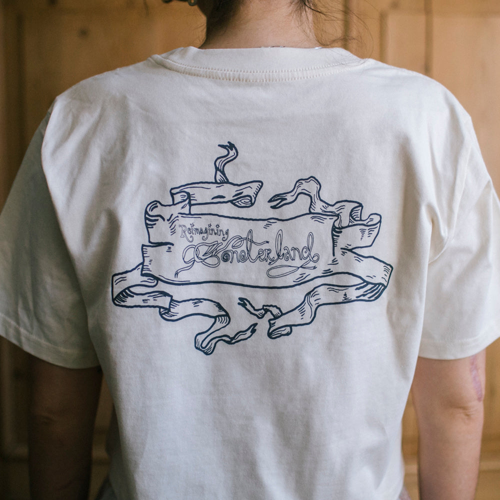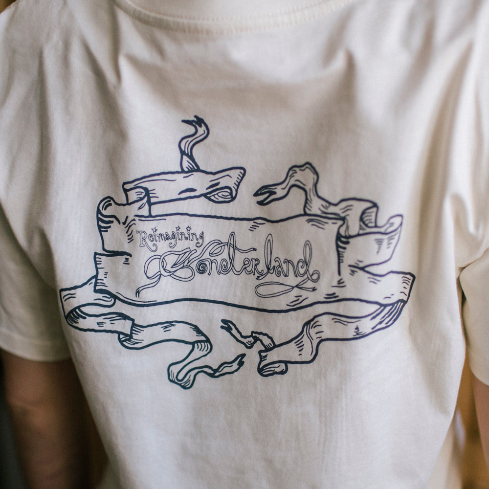 Screen-printed by Panther Press in rich charcoal ink on ultra-soft off-white cotton, with Doll House Girl on the front and the Reimagining Wonderland banner on the back.