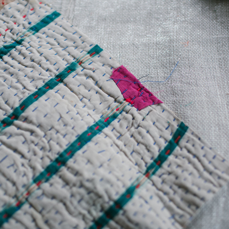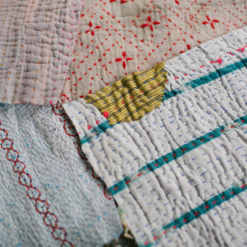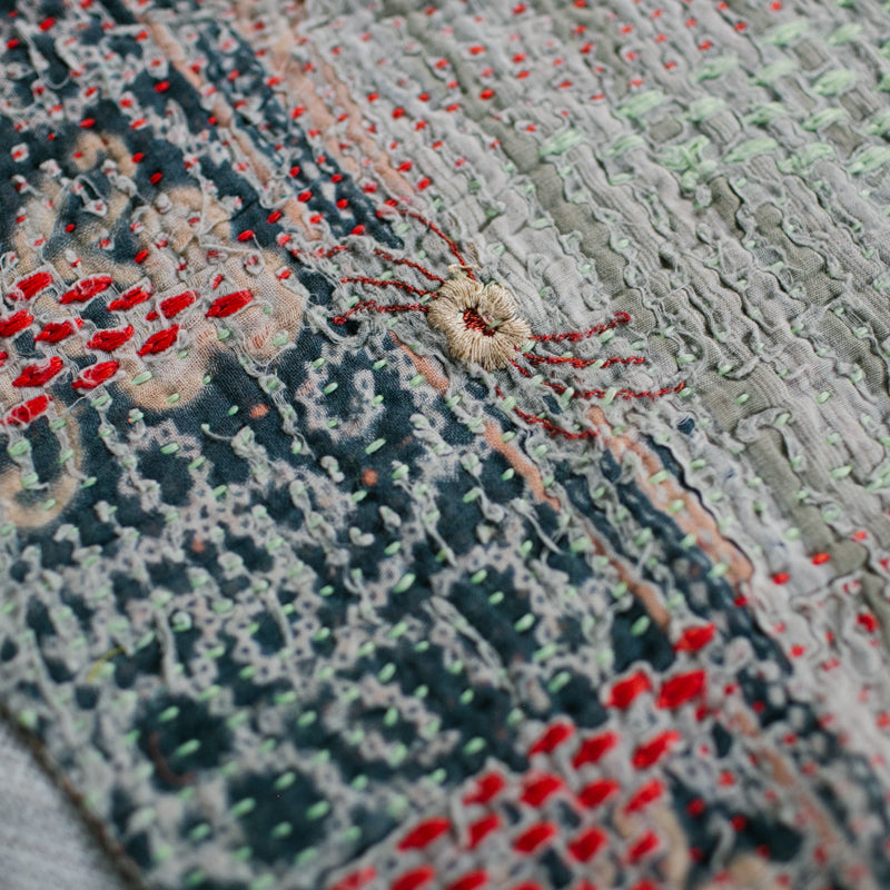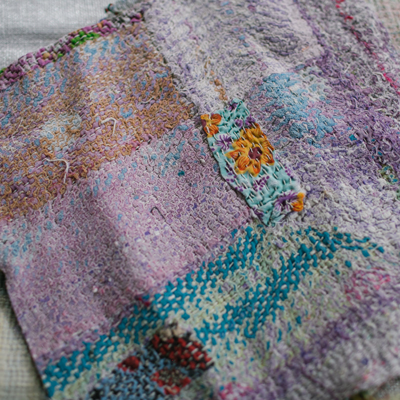 Kantha is one of the oldest and most traditional forms of embroidery originating in India, and is still ritually practiced today by millions of South Asian women. The word “Kantha” defined means ‘making whole again that which was once fragmented or broken.’