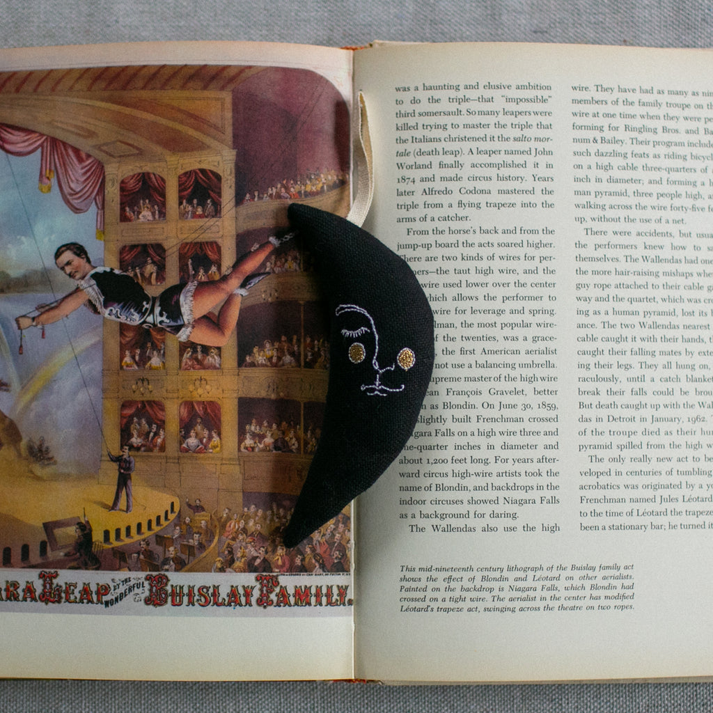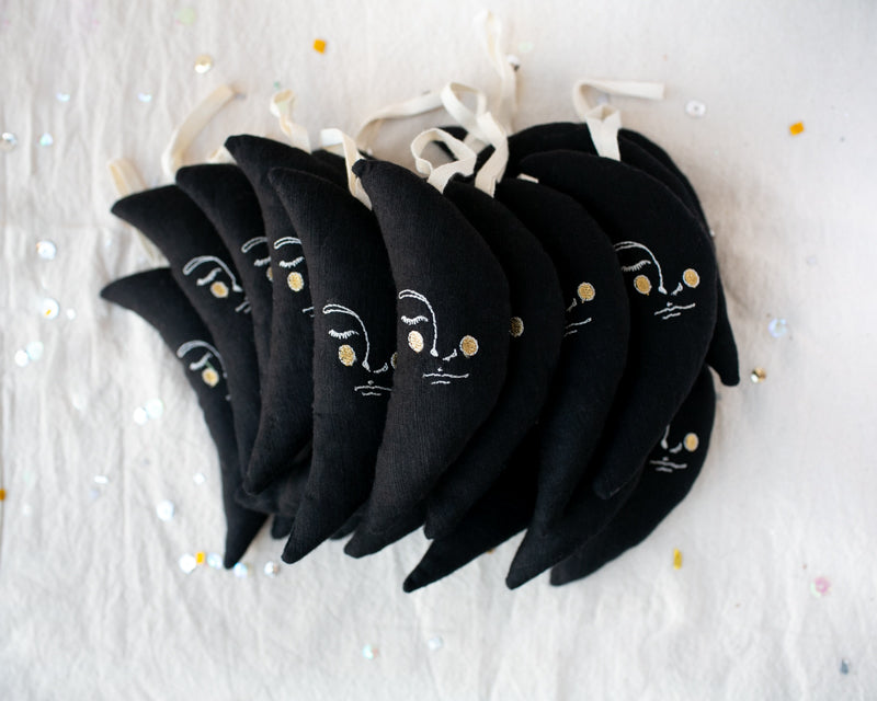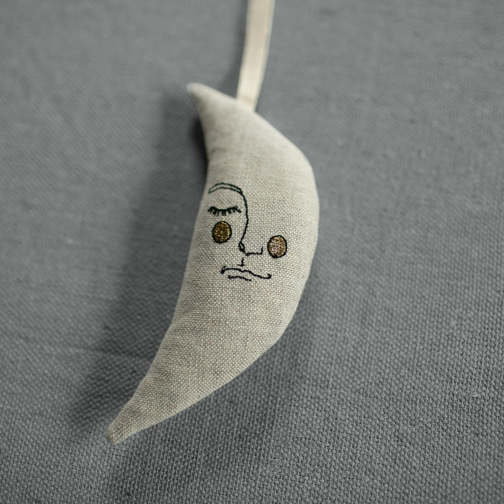 Charming free motion stitched moon ornament, made from natural linen, organic cotton stuffing and a handful of fragrant lavender. Stitched on the sewing machine with embroidery thread and metallic floss. Natural twill tape ribbon stitched to the top to hang from any sweet spot. Approx 4" in length 2" in width.