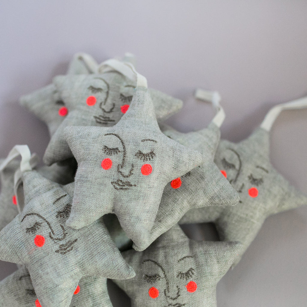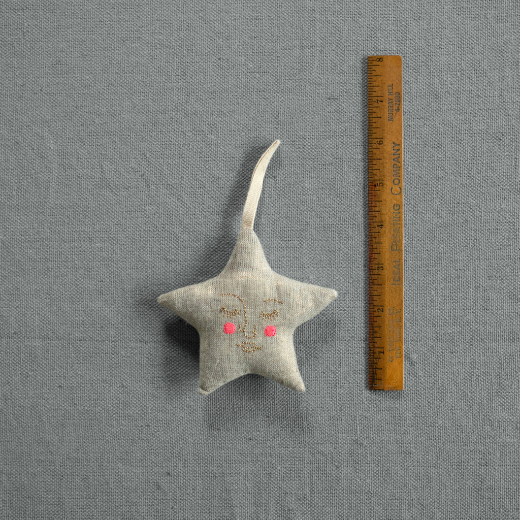 This Handsome Star token is machine embroidered in gold and neon pink threads on natural colored mineral linen. Hand cut, turned and stuffed with a handful of lavender and organic cotton stuffing. Natural twill tape attached to the top for hanging.