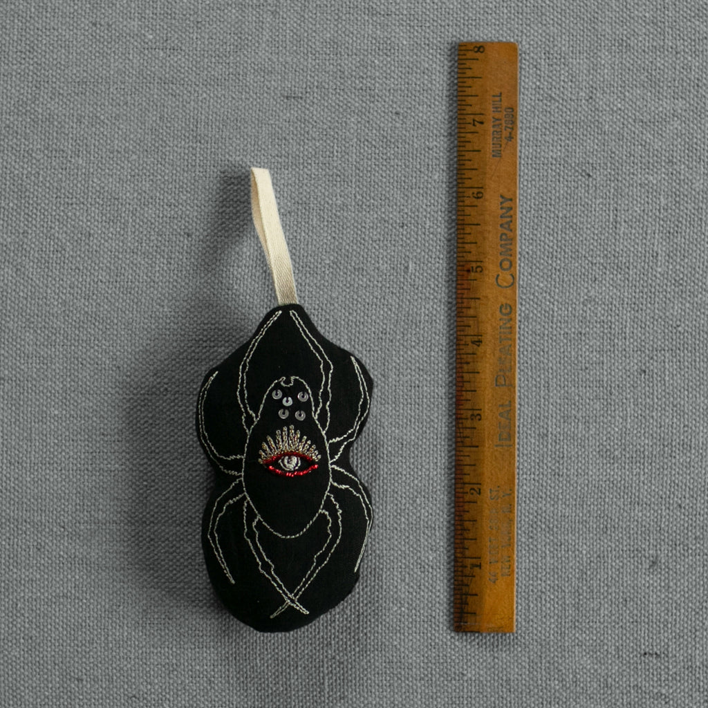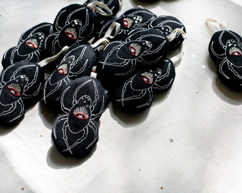 Spooky handmade spider ornaments. Machine embroidered on soft black linen, hand embellished with metallic sequins and red bullion wire.