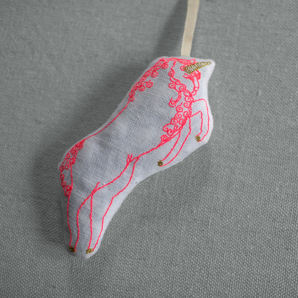 Our Magical Unicorn is machine embroidered in neon pink thread on soft white linen. Hand cut, turned and stuffed with a handful of lavender and organic cotton stuffing. Natural twill tape for hanging.