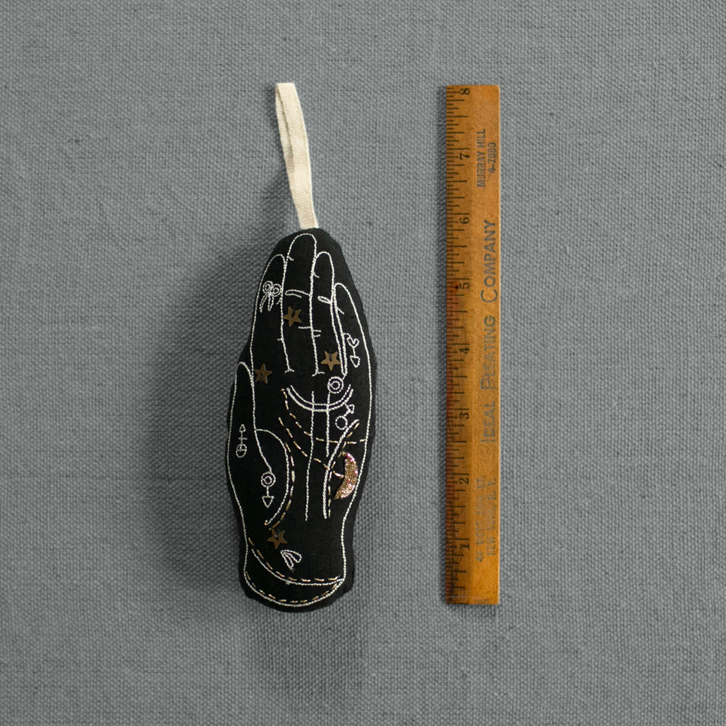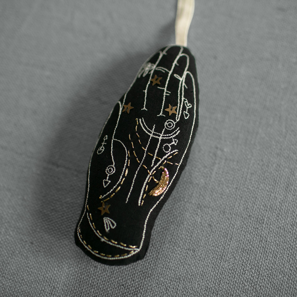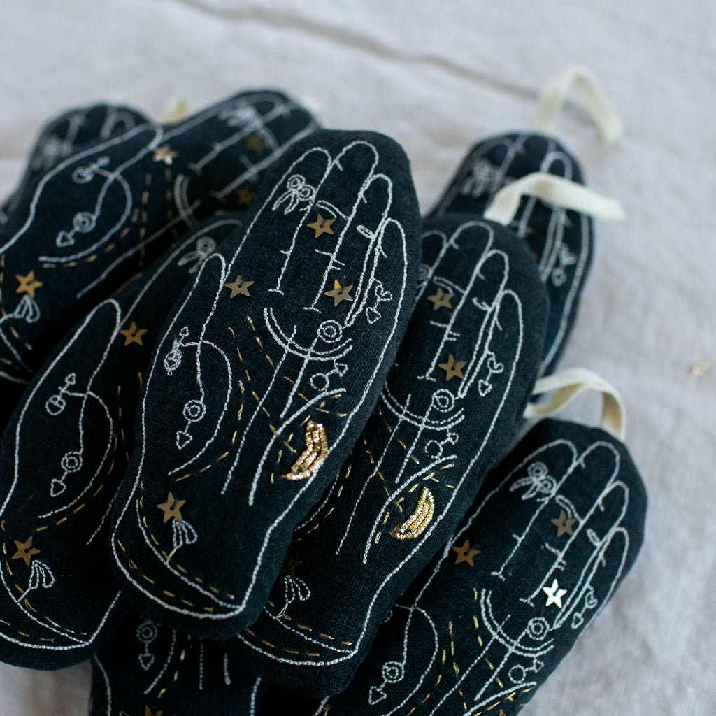 Embellished with hand stitched gold threads, gold bullion moon, and sequin stars.