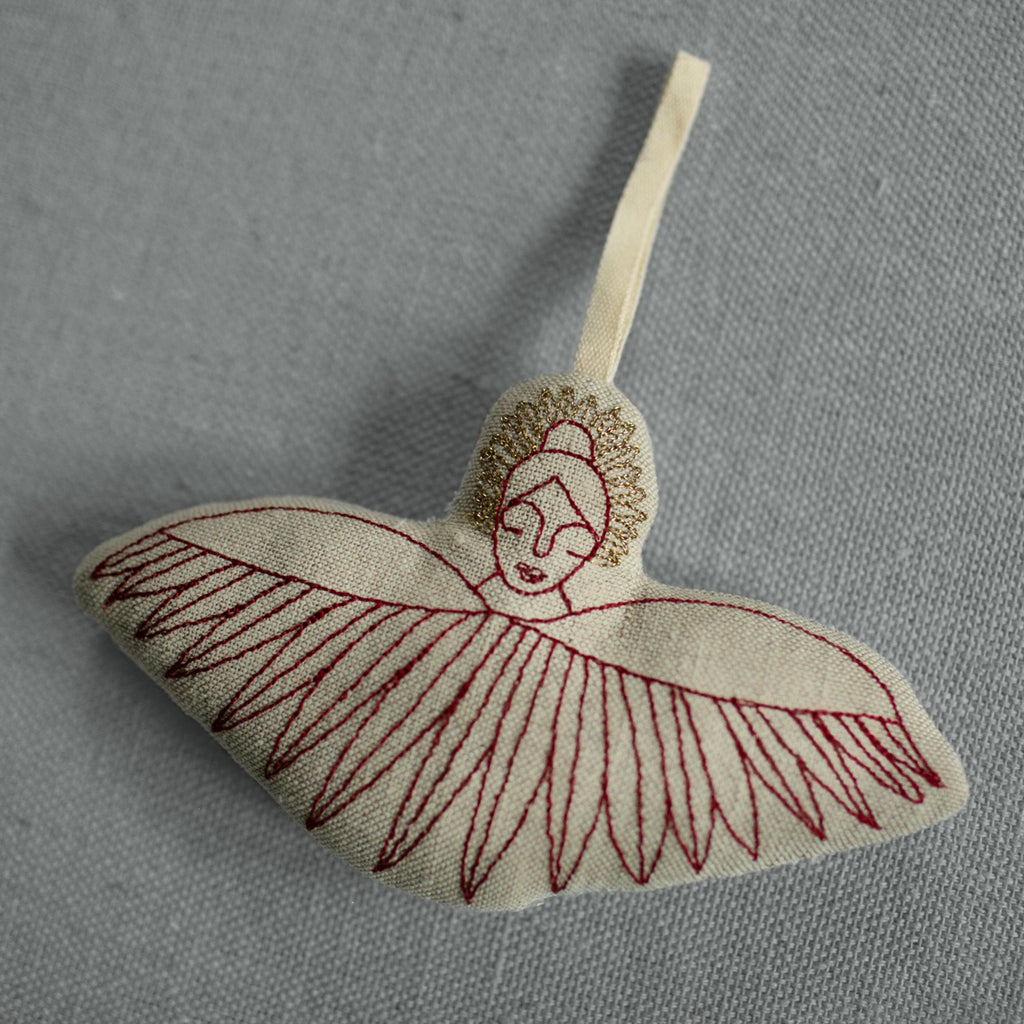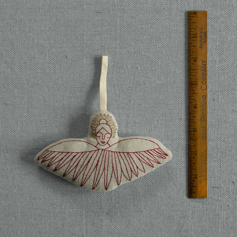 These curious creatures were created from my original illustration inspired by vintage folkloric imagery. Each one is machine embroidered in crimson red + gold threads on natural linen. Hand cut, turned and stuffed with a handful of scented lavender and organic cotton stuffing. Natural twill tape for hanging.