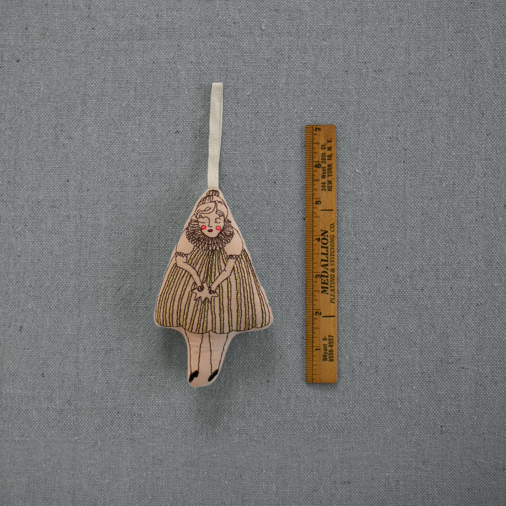 Sweet little lavender scented ornament of a little lady holding her wishing star. Completely handmade, machine embroidered on soft pink linen in various colorful and metallic threads. Hand turned and stuffed with a handful of scented lavender and a bit of natural cotton stuffing. Natural twill tape for hanging. Beautiful for hanging for the holidays, putting on a gift or standing in a little special spot. Dimensions- 5.5. " tall x 3.5" wide.
