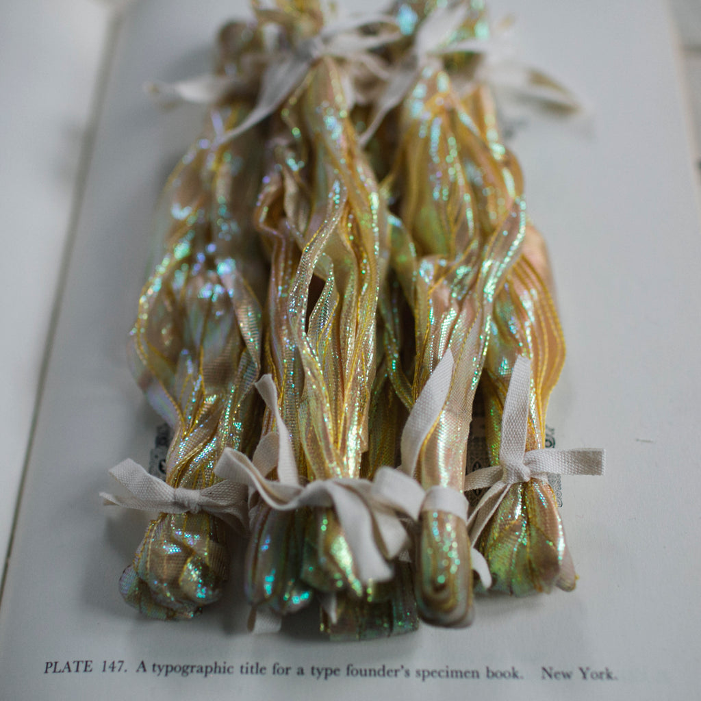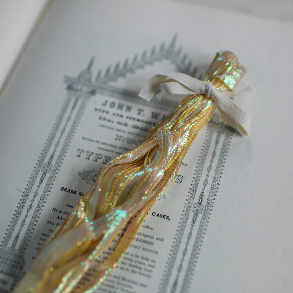 Enjoy a delightful vintage bundle of shimmering lurex ribbon, recently unearthed from one of our ribbon treasure troves in India.