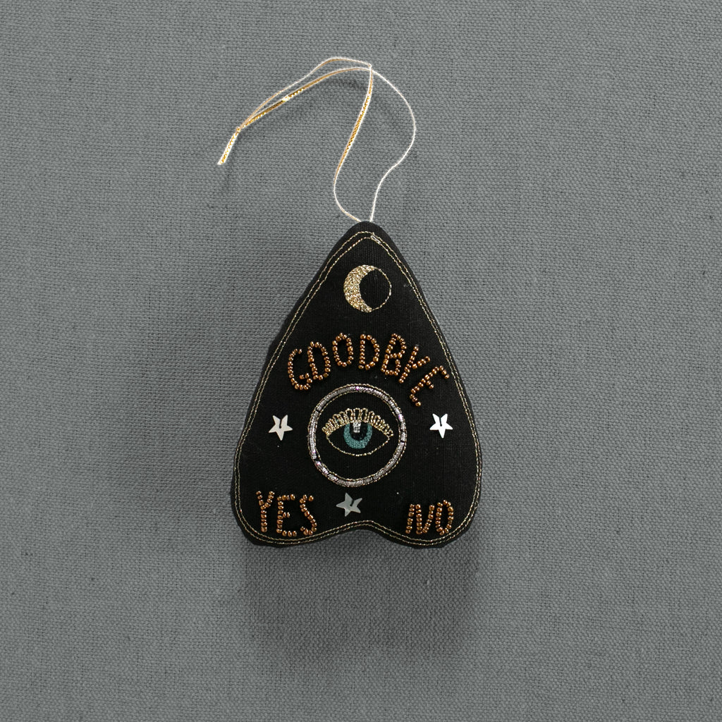 'Planchette' is penned from Emma’s own imagination and handcrafted using a combination of embroidery and beadwork techniques on assorted linens, and stuffed with organic cotton and French lavender— a scent known to relieve feelings of stress, as well as act as a natural pest repellent.
