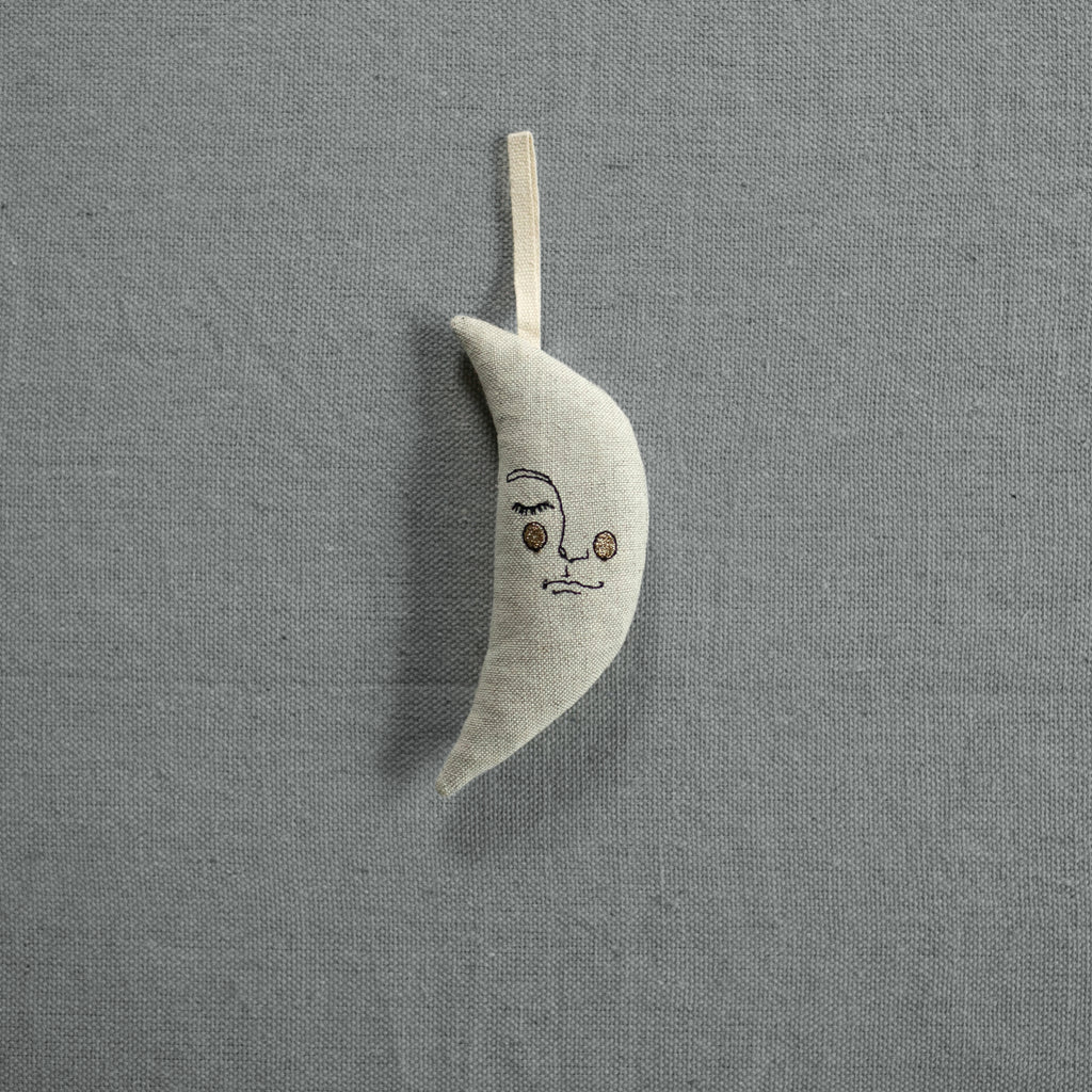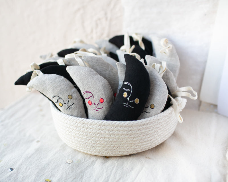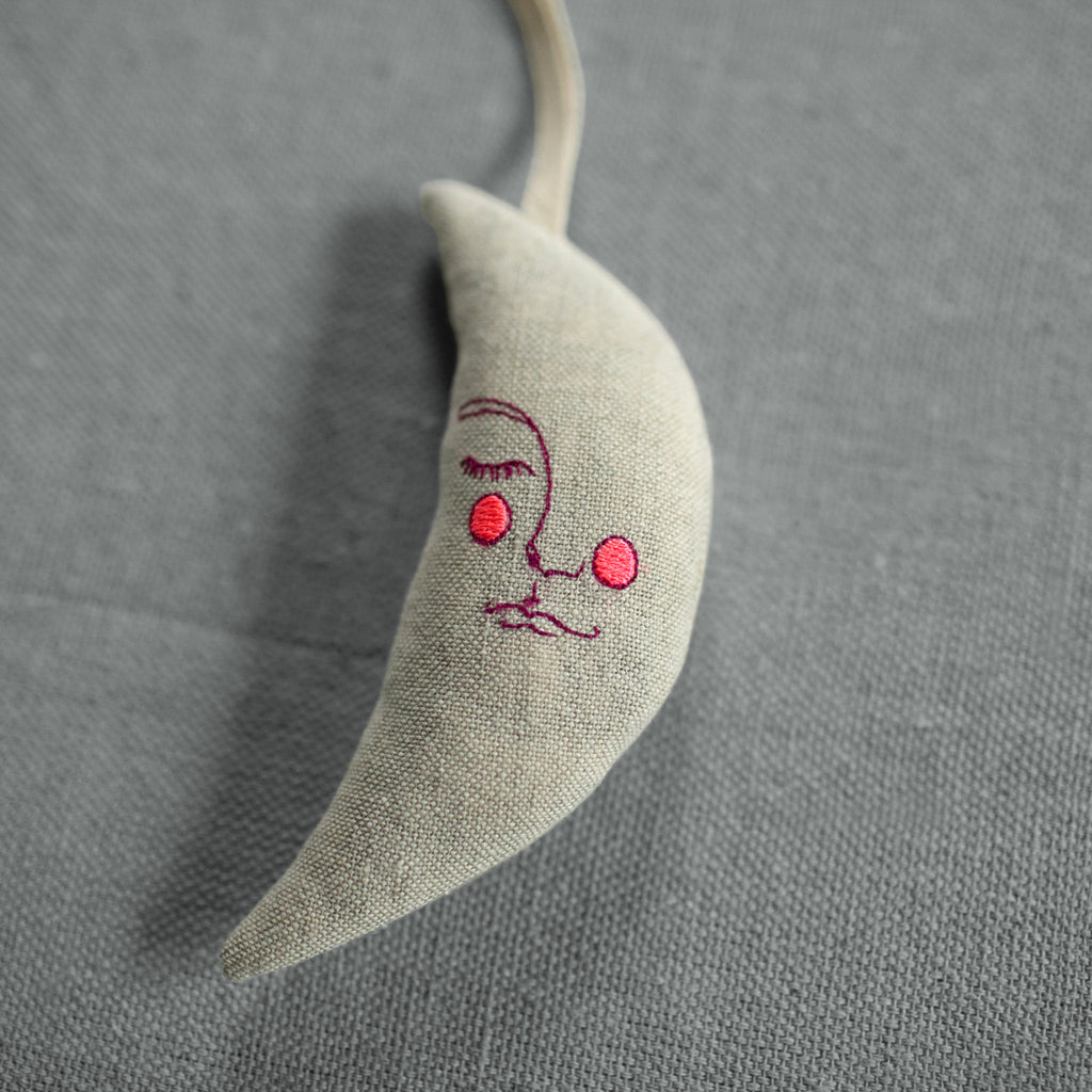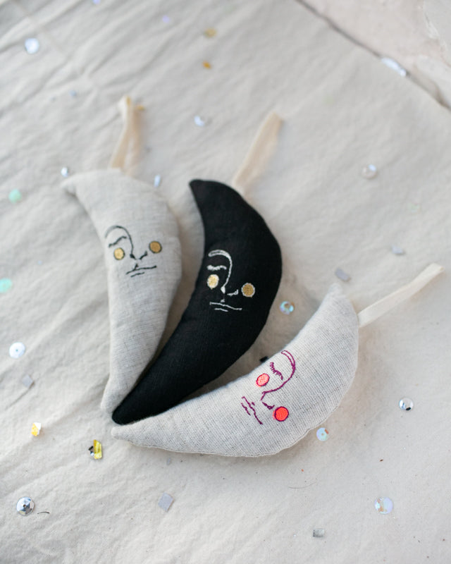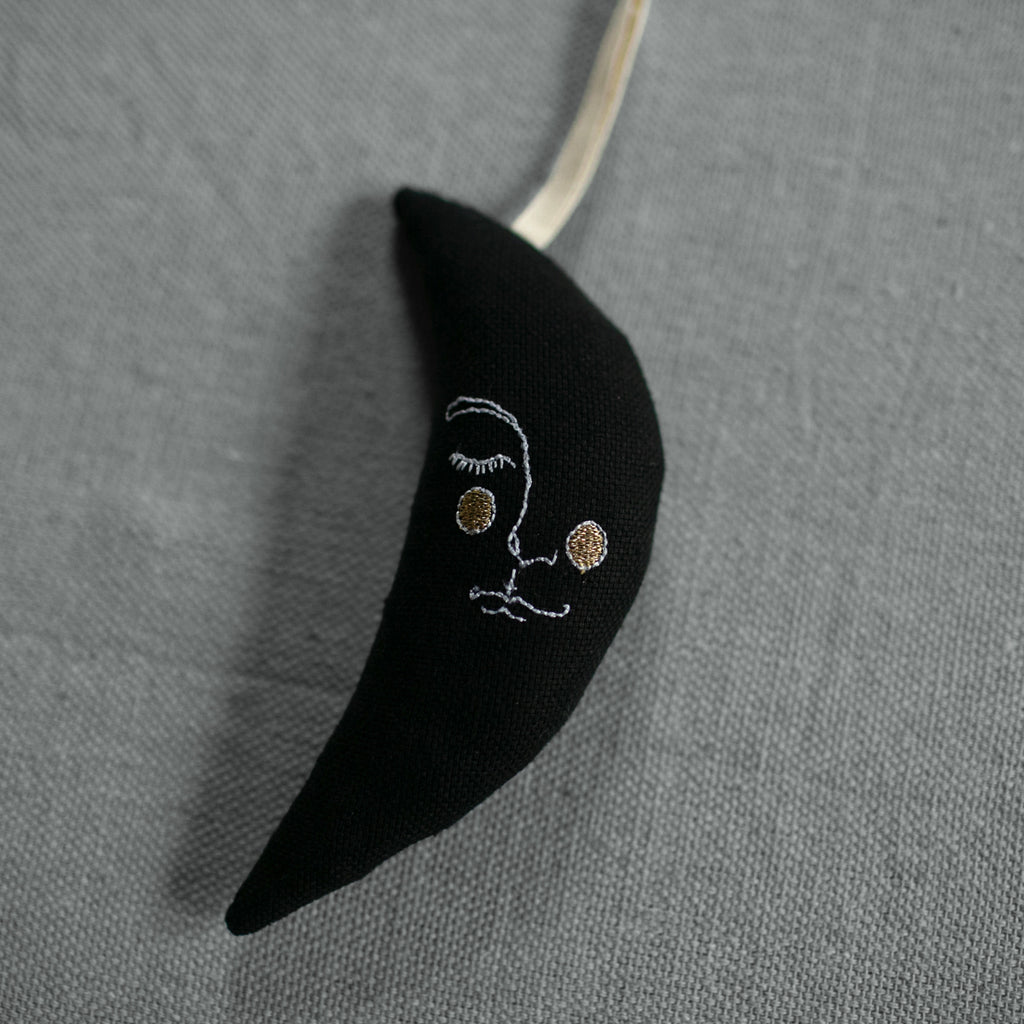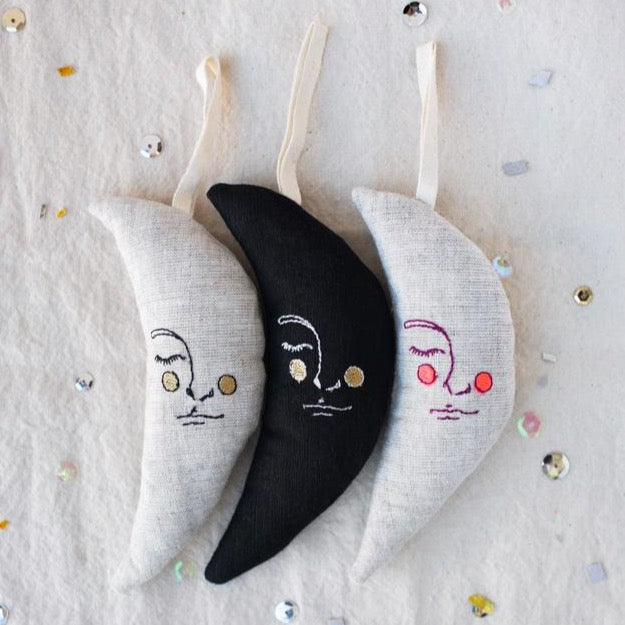 Charming free motion stitched moon ornament, made from natural linen, organic cotton stuffing and a handful of fragrant lavender. Stitched on the sewing machine with embroidery thread and metallic floss. Choose one of 3 styles- black embroidery floss on beige natural linen, purple embroidery floss on beige natural linen, or white embroidery floss on black linen. With metallic gold cheeks, or neon pink cheeks. Natural twill tape ribbon stitched to the top to hang from any sweet spot. Approx 4" in length 2" in width.
