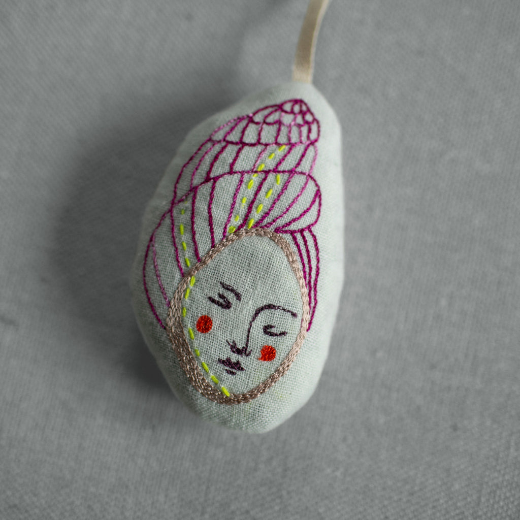This sweet little shell person is machine embroidered in dark magenta thread on a soft blue linen.