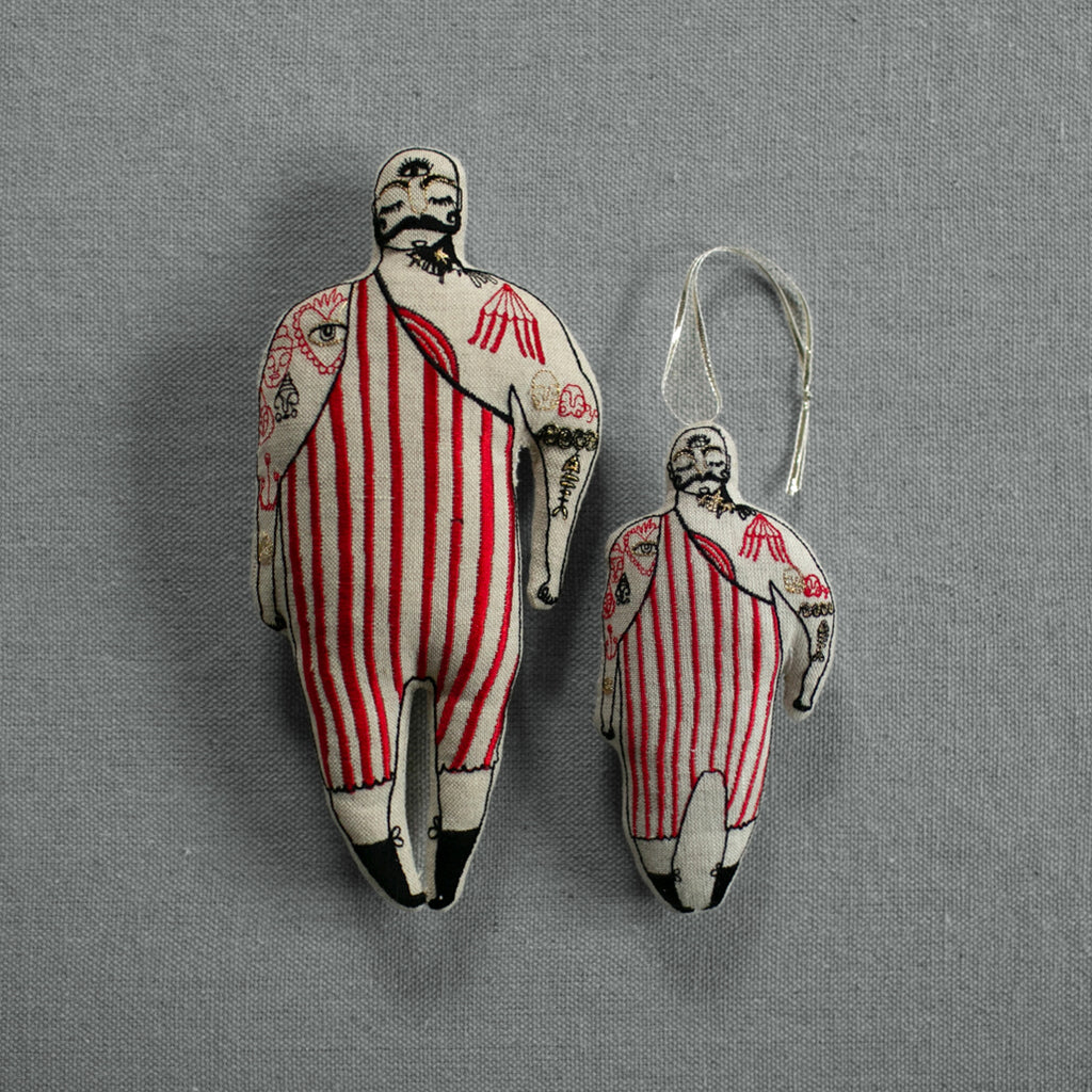Photographed beside our mini Tattooed Strong Man Ornament.
