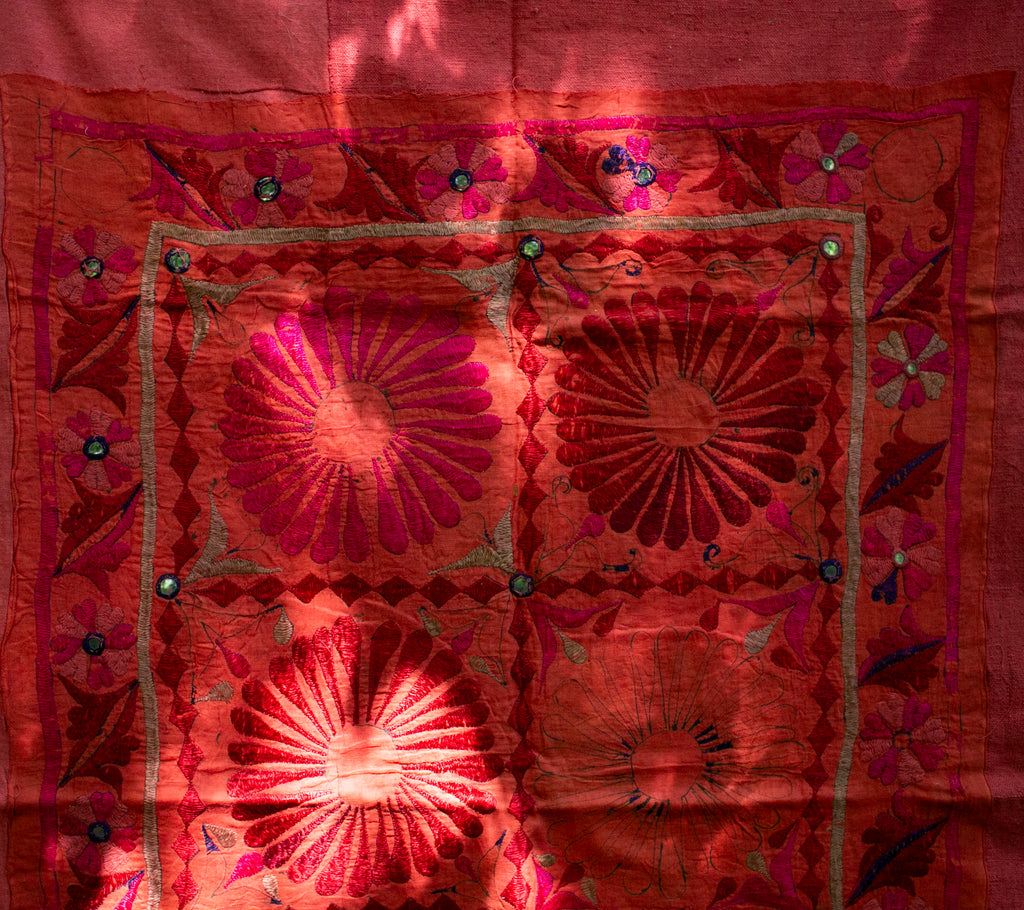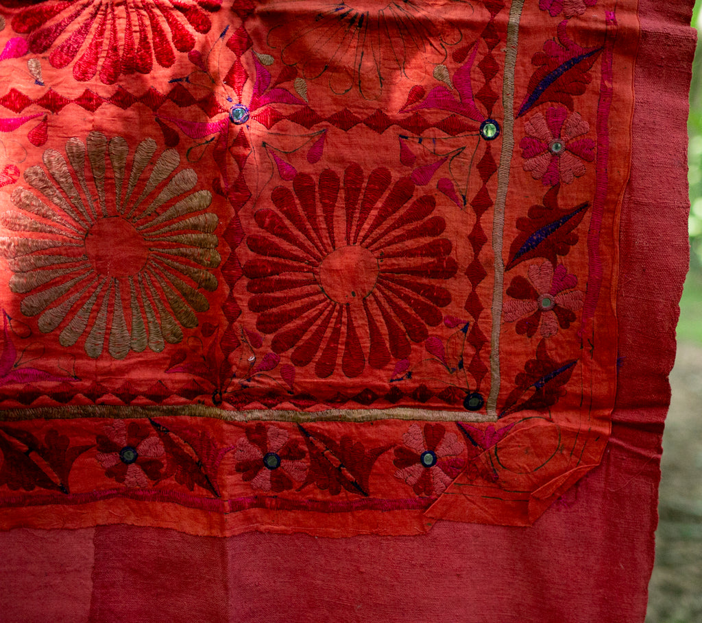 This antique embroidered textile was sourced from a vintage market in Delhi, India. Each piece was handpicked for its intricacy, color, purpose, and potential. It would look stunning as a tapestry, framed, repurposed into a home decor item or garment, or saved for a creative project on a rainy day. Use your imagination!