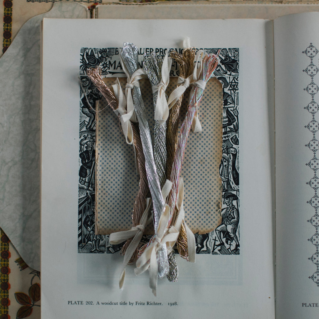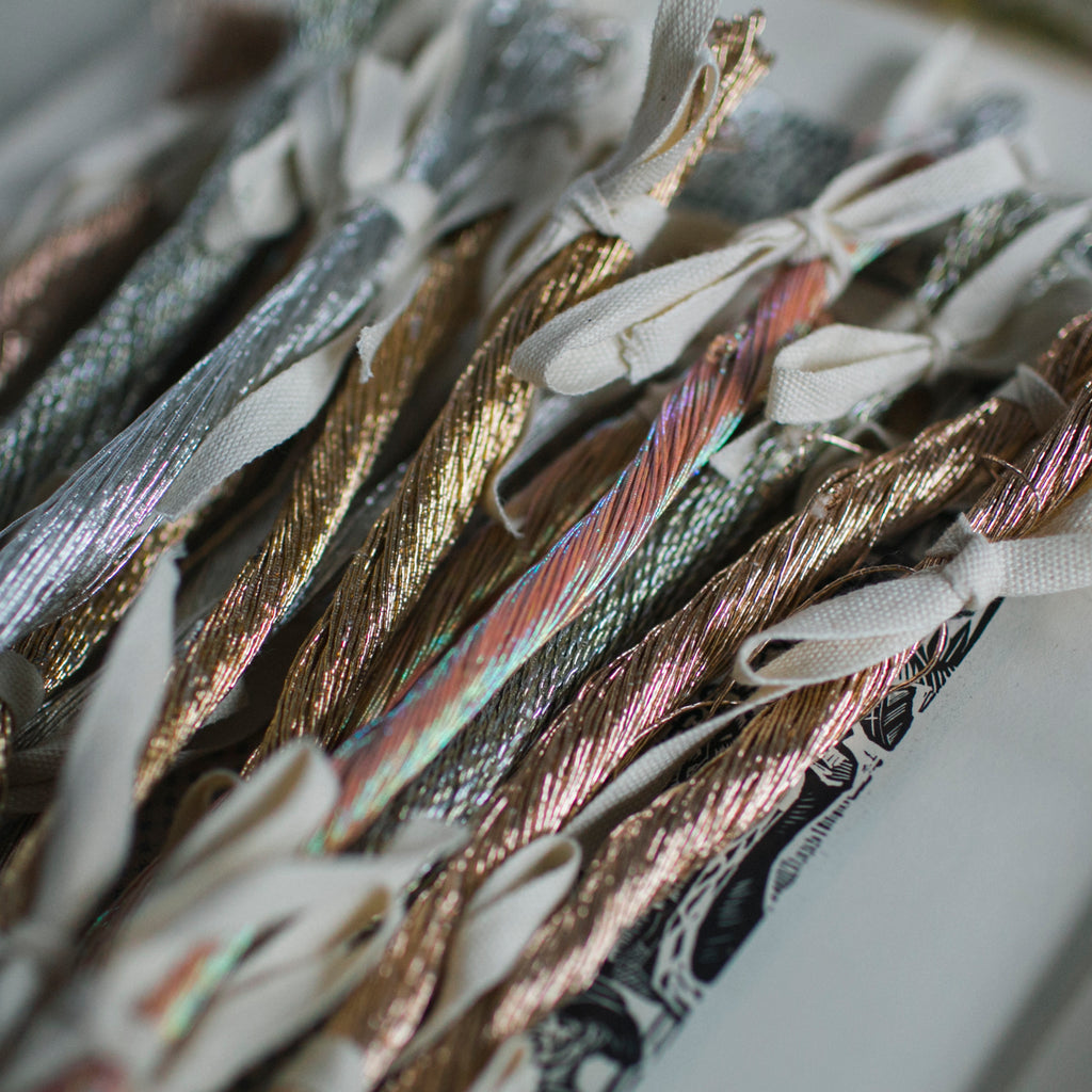 Enjoy a beautiful bundle of shimmering lurex threads, recently unearthed from one of our ribbon treasure troves in India.
